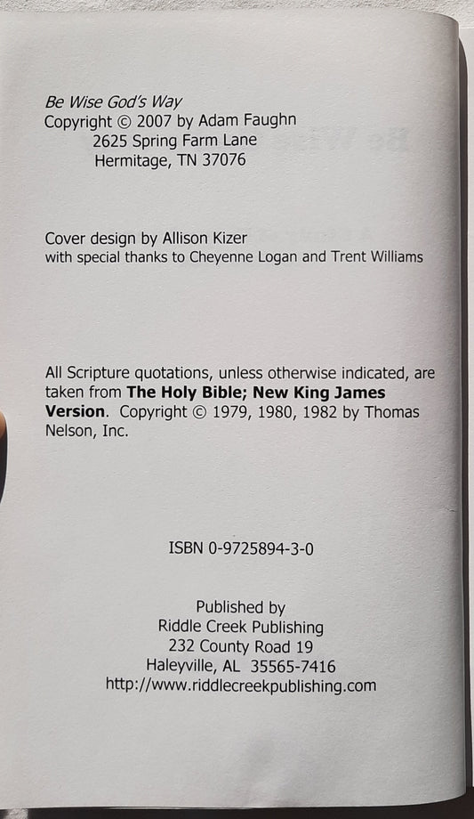 Be Wise God's Way: A Study of Proverbs & Ecclesiastes by Adam Faughn (Very good, 2007, PBk, 97 pages, Riddle Creek Pub.)