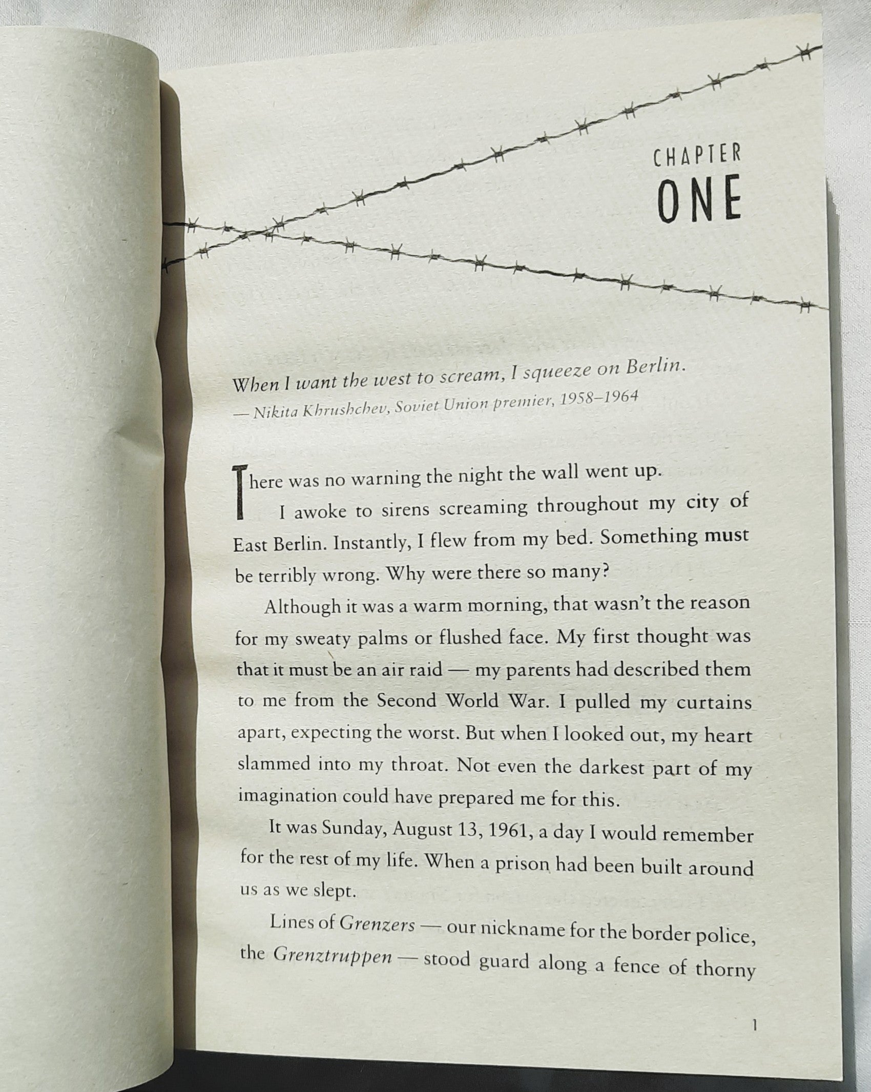 With the rise of the Berlin Wall, Gerta finds her family suddenly divided. She, her mother, and her brother Fritz live on the eastern side, controlled by the Soviets. Her father and middle brother, who had gone west in search of work, cannot return home. Gerta knows it is dangerous to watch the wall, yet she can't help herself. She sees the East German soldiers with their guns trained on their own citizens; she, her family, her neighbors and friends are prisoners in their own city.
