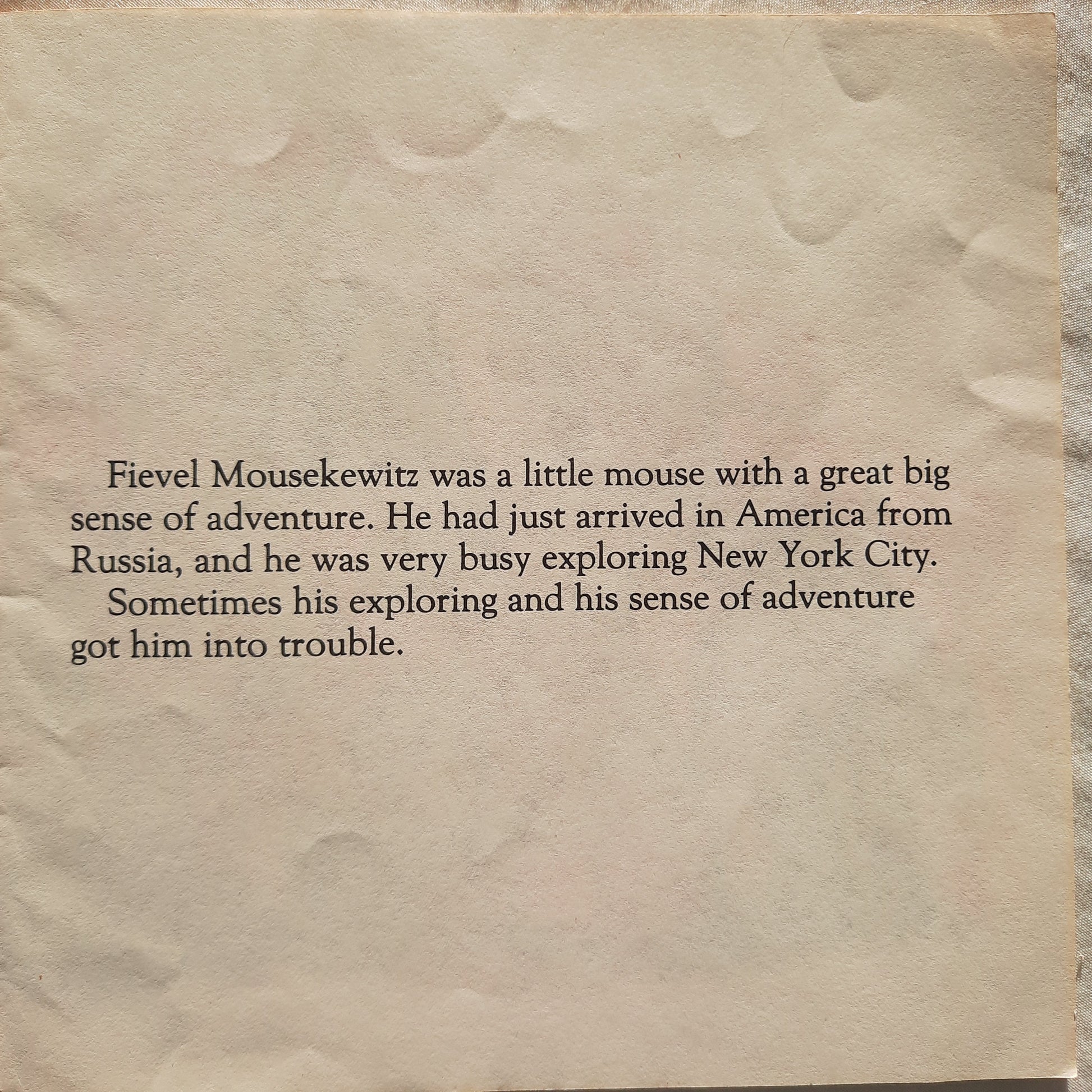 This collectible book, a McDonald's Restaurant Kid's Meal prize, features the Russian Mousekewitz family who flee persecution to travel to America. Along the way, Fievel Mousekewitz has many adventures including meeting a friendly cat named Tiger.
