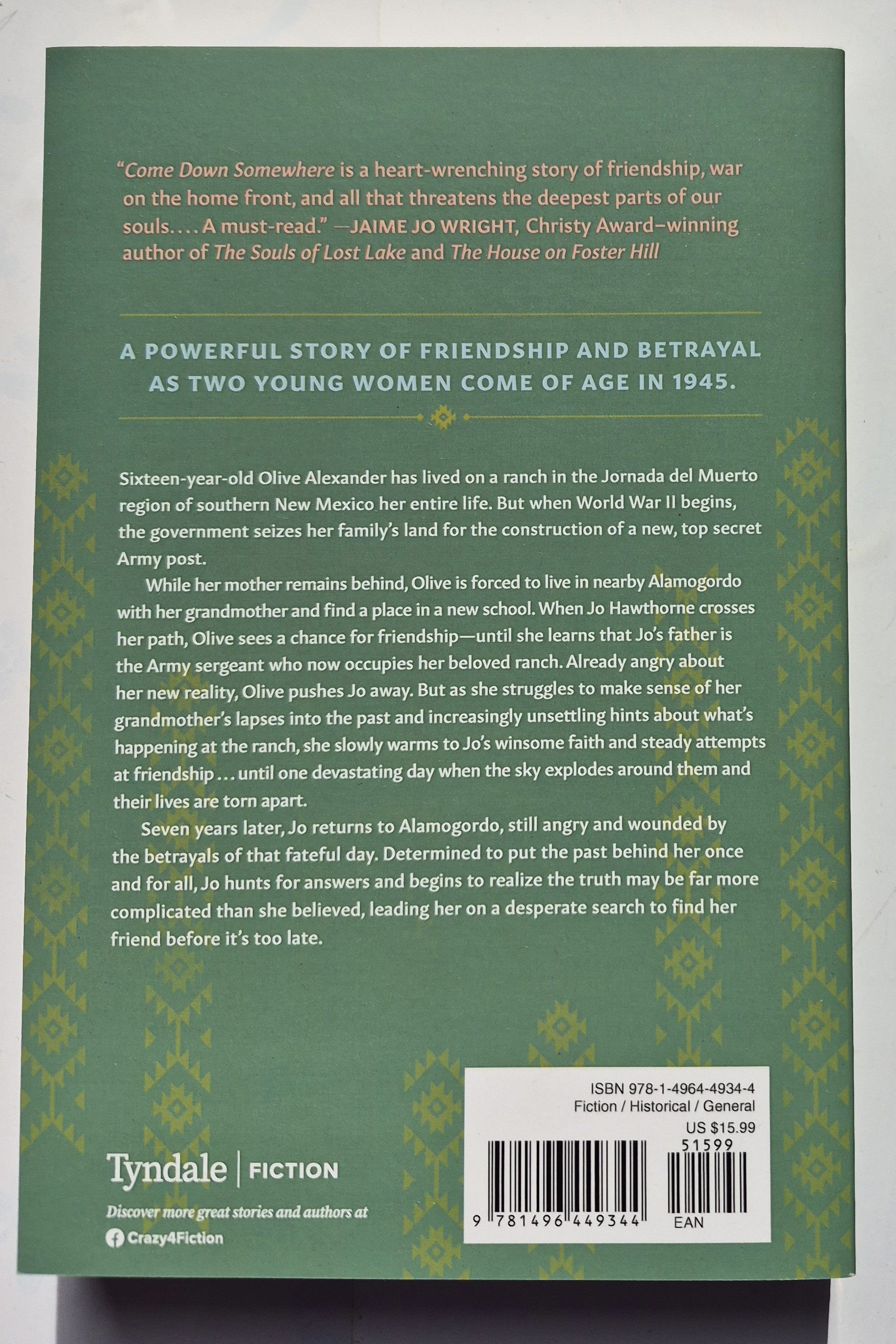 While her mother remains behind, Olive is forced to live in nearby Alamogordo with her grandmother and find a place in a new school. When Jo Hawthorne crosses her path, Olive sees a chance for friendship—until she learns that Jo’s father is the Army sergeant who now occupies her beloved ranch. Already angry about her new reality, Olive pushes Jo away. But as she struggles to make sense of her grandmother’s lapses into the past and increasingly unsettling hints about what’s happening at the ranch, she slowly warms to Jo’s winsome faith and steady attempts at friendship . . . until one devastating day when the sky explodes around them and their lives are torn apart.