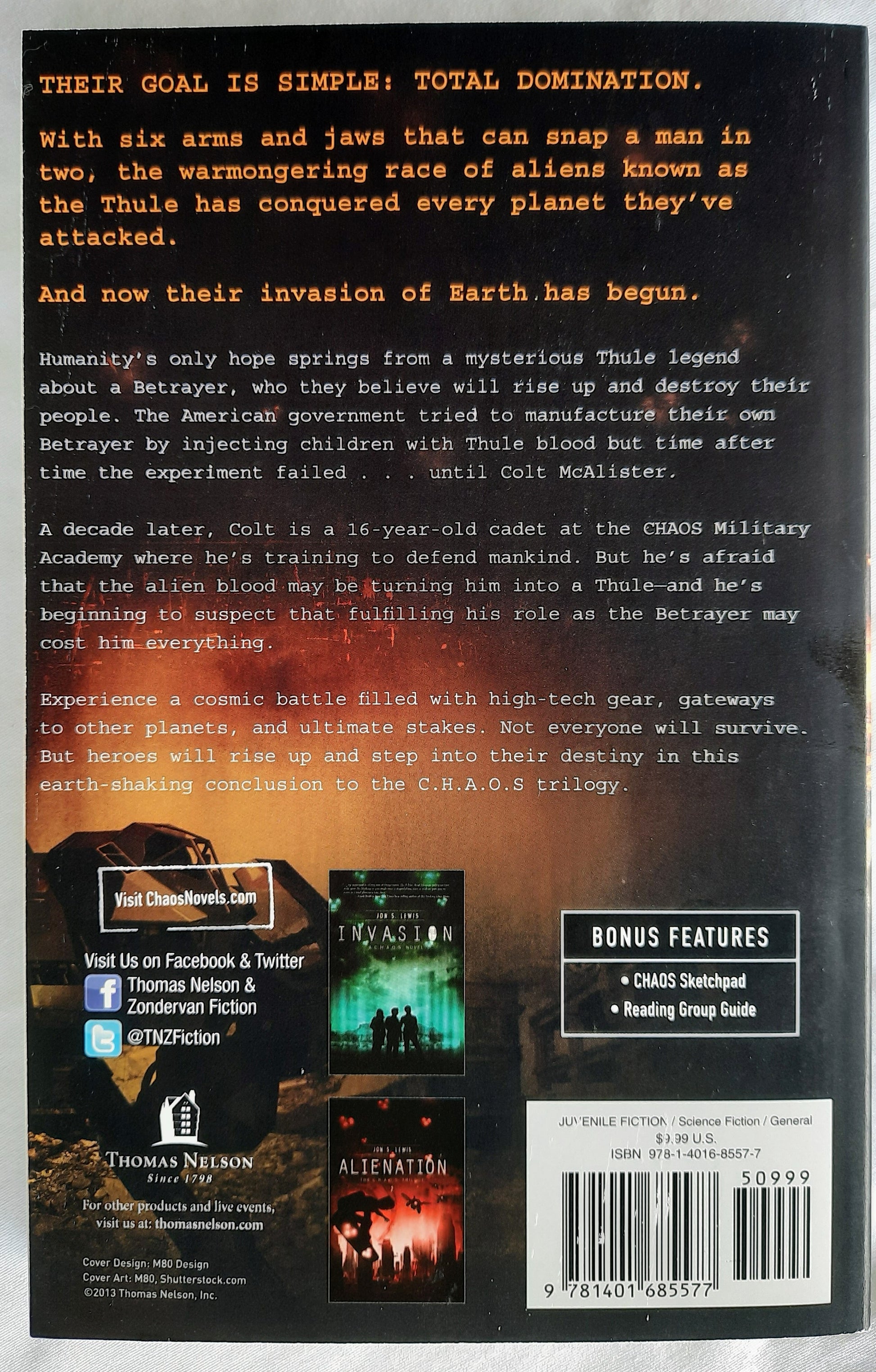A decade later, Colt is a 16-year-old cadet at the CHAOS Military Academy where he’s training to defend mankind. But he’s afraid that the alien blood may be turning him into a Thule—and he’s beginning to suspect that fulfilling his role as the Betrayer may cost him everything.