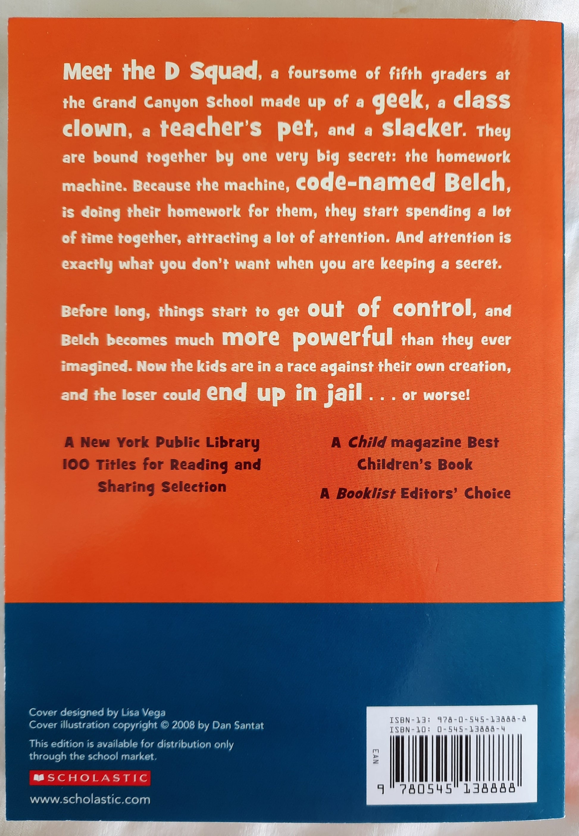Meet the D Squad, a foursome of fifth graders at the Grand Canyon School made up of a geek, a class clown, a teacher's pet, and a slacker. They are bound together by one very big secret: the homework machine. Because the machine, code-named Belch, is doing their homework for them, they start spending a lot of time together, attracting a lot of attention. And attention is exactly what you don't want when you are keeping a secret.
