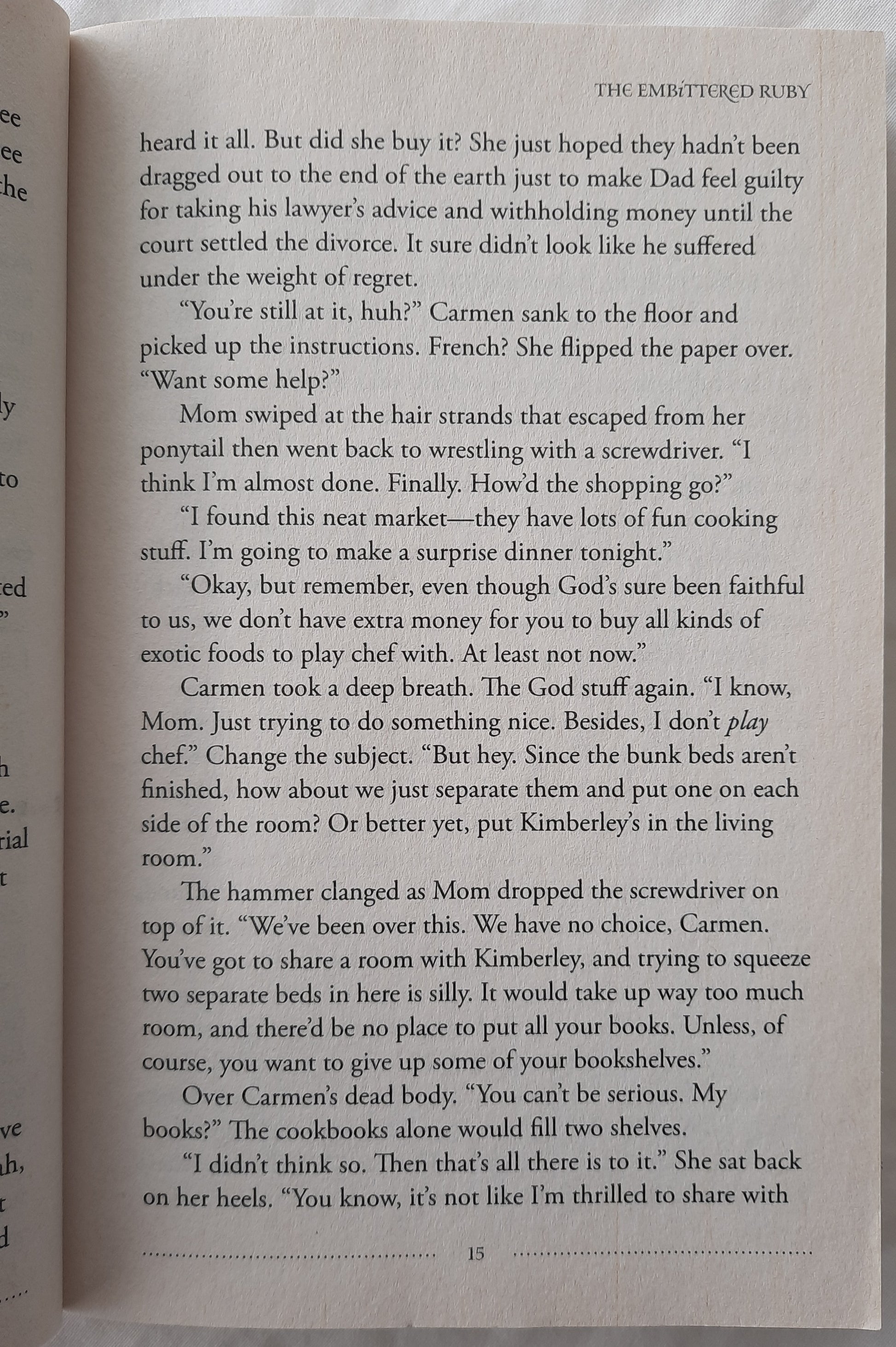 Sixteen-year-old Carmen Castillo prays that her parents will patch things up so she can return to her once-lavish life. Trapped by resentment and anger, she heads to Diamond Estates hoping to find some healing for her embittered soul. Desperately homesick, Carmen concludes there is no such thing as ruby slippers. . .but is there still a chance she’ll get what her heart longs for? Or will her troubled soul remain forever embittered?