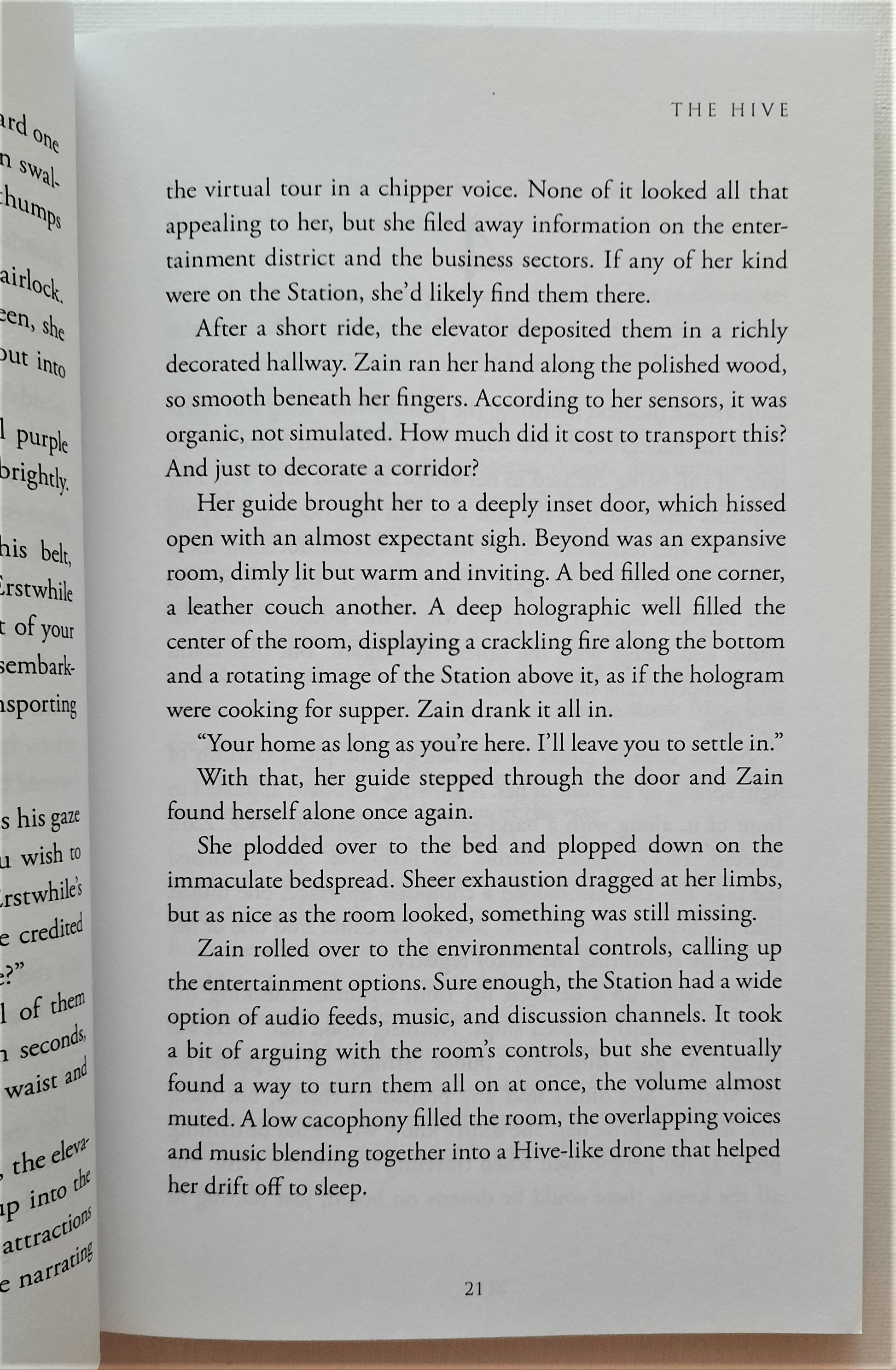 Why is Zain pregnant? She belongs to the Hive, a collective of cyborgs who choose to live apart from the rest of human society. At times, the Hive rent out some of their females to produce tailor-made children for paying couples. But Zain is an engineer, not a breeder. When she finds herself separated from the Hive, she decides to find the person who she thinks ordered the baby. Surely they'll help her find her way home.