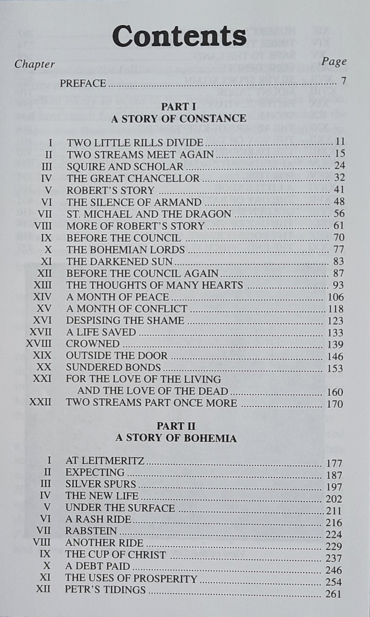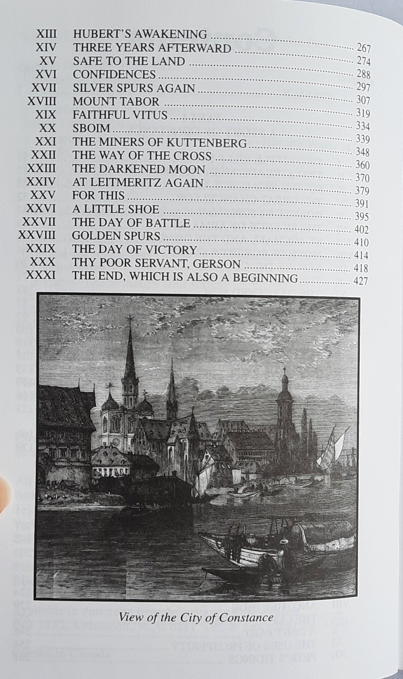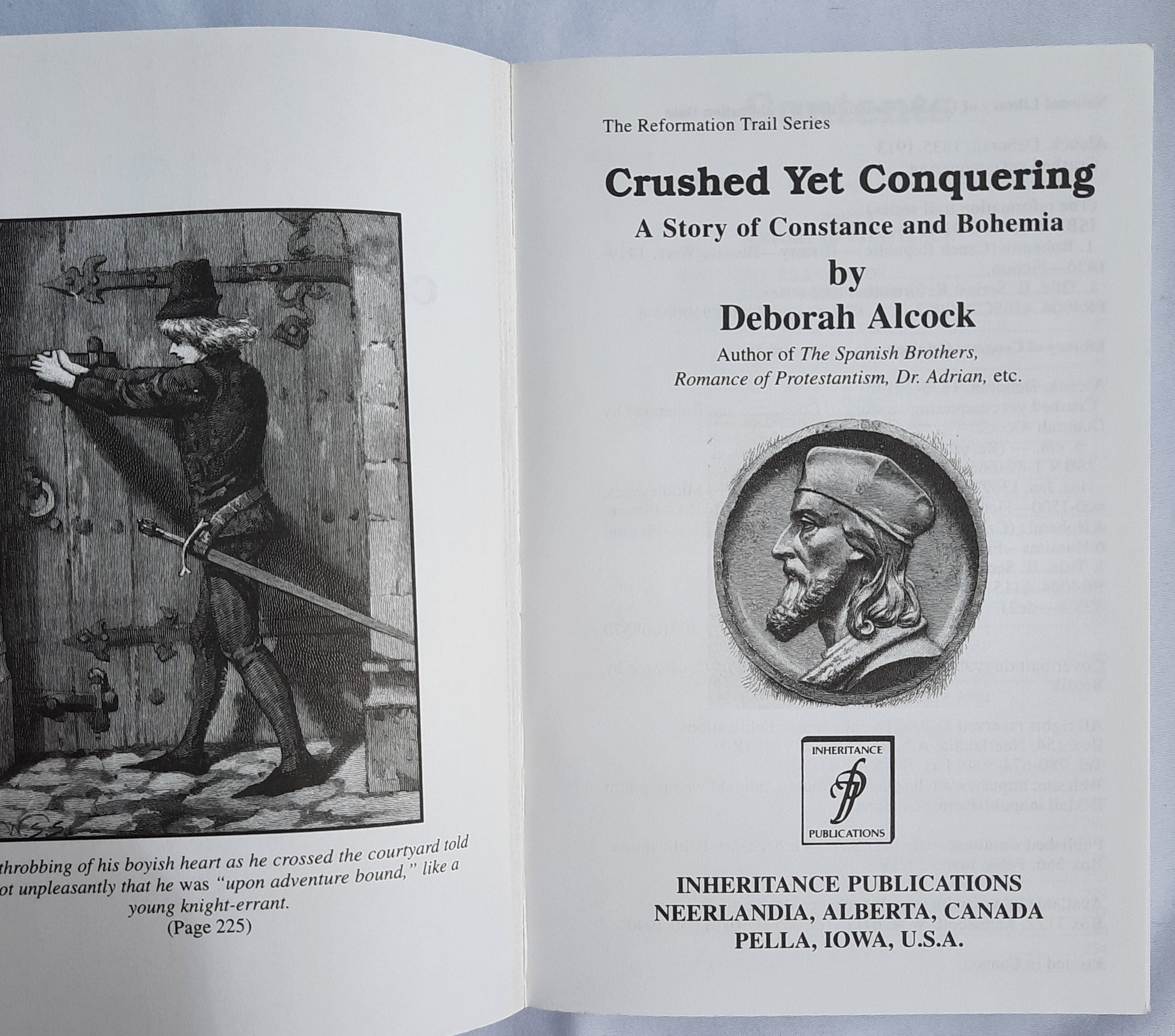 Crushed Yet Conquering is a book in two parts, the first about the Holy Council and Huss in Constance, and the second about life in Bohemia, Huss’s homeland. Hubert, now a squire, encounters all sorts of difficulties and hair-raising adventures during the papal crusades against his adopted country. Eventually he finds both earthly and heavenly contentment.
