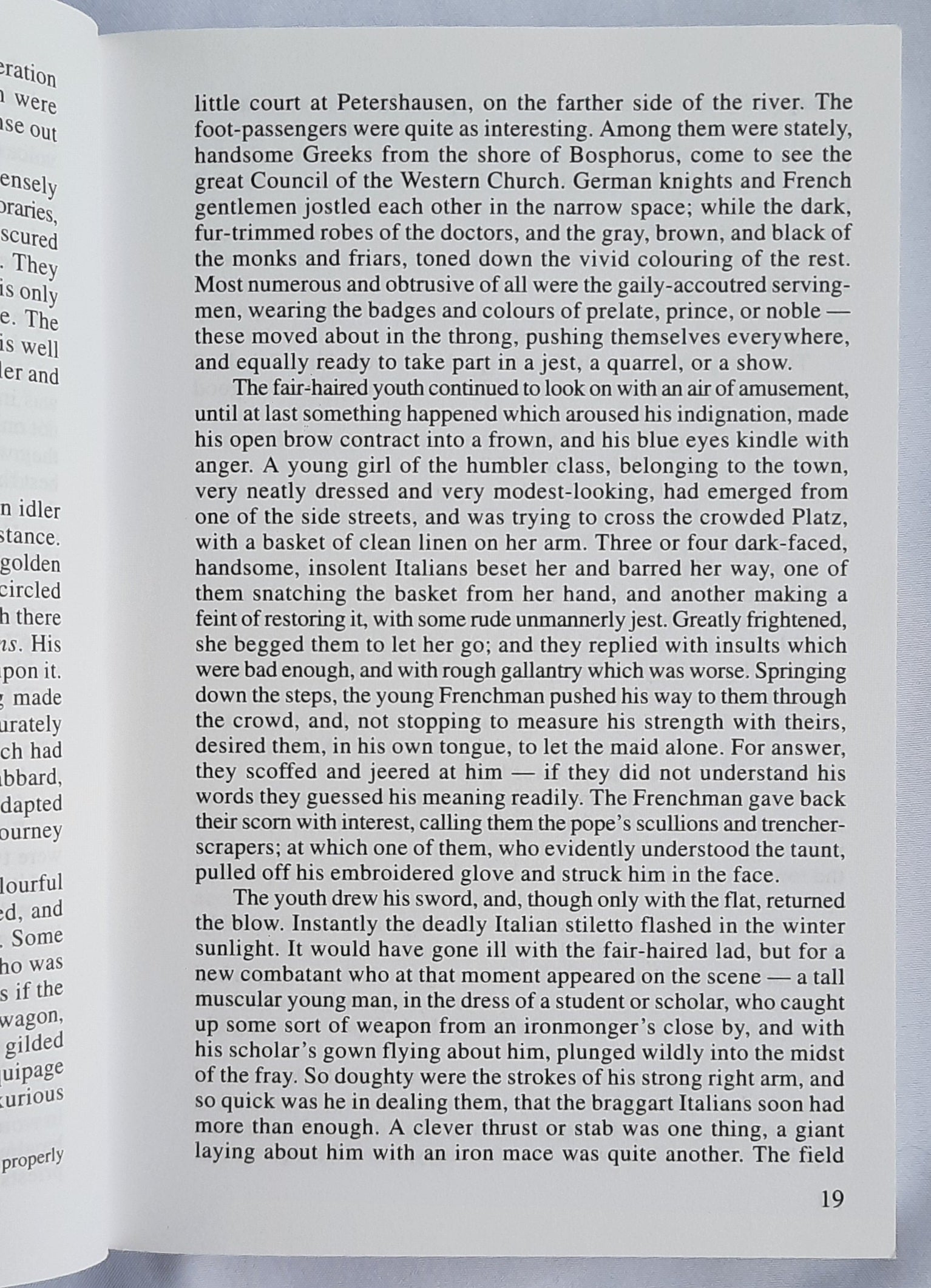 As young Hubert, trained as a scholar but with the heart and body of a squire, roams the city of Constance, he meets not only his long-lost brother but also Robert who guards the prisoner John Huss and reveres him greatly. The mysterious and gentle Huss fascinates Hubert. As the Holy Council begins to try Huss, conflict builds in Hubert. We all know what happened to Huss, but what happened to Hubert and to his beloved master as a result of Huss’s martyrdom?