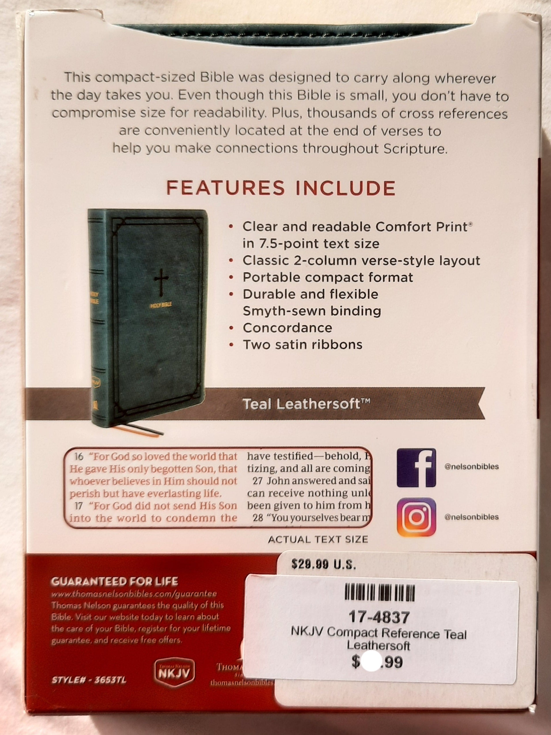 NKJV Compact Reference Bible Teal Leathersoft (New, 2020, Leathersoft, 1856 pages, Thomas Nelson)