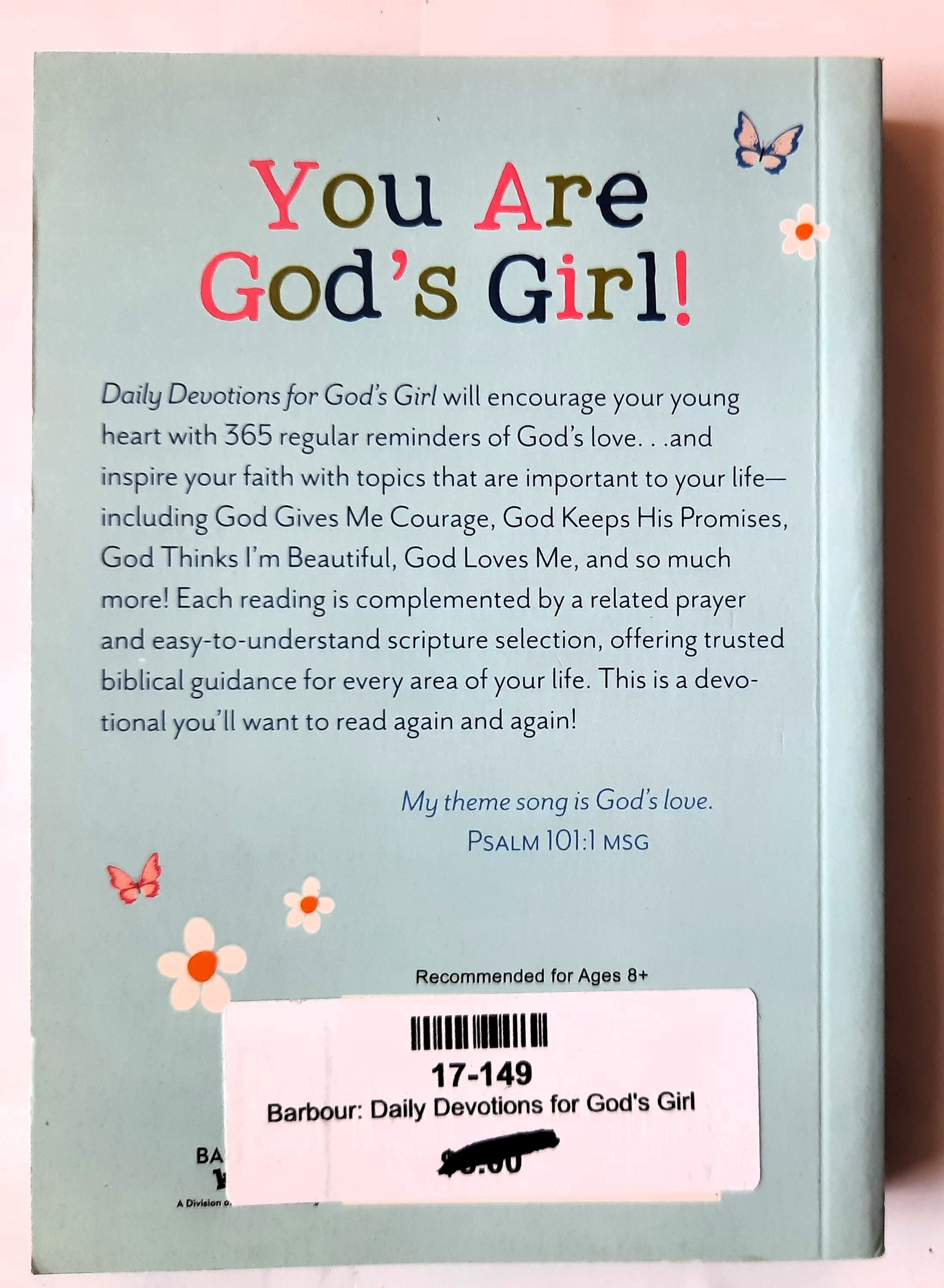 Daily Devotions for God's Girl, for readers ages 8 and up, features 365 readings that will encourage your heart with regular reminders of God's love. Each devotional reading touches on relevant life topics such as: Faith, Forgiveness, Friendship, and more. . . Engaging and thought-provoking prayers and easy-to-understand Scripture selections, all in one fun, portable package that will inspire you to grow up God's way.