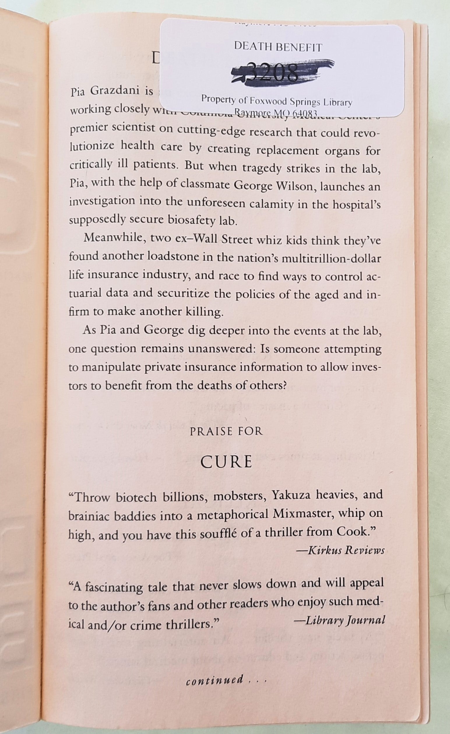 Death Benefit by Robin Cook (Very good, 2012, Pbk, 530 pages, Berkley Books)
