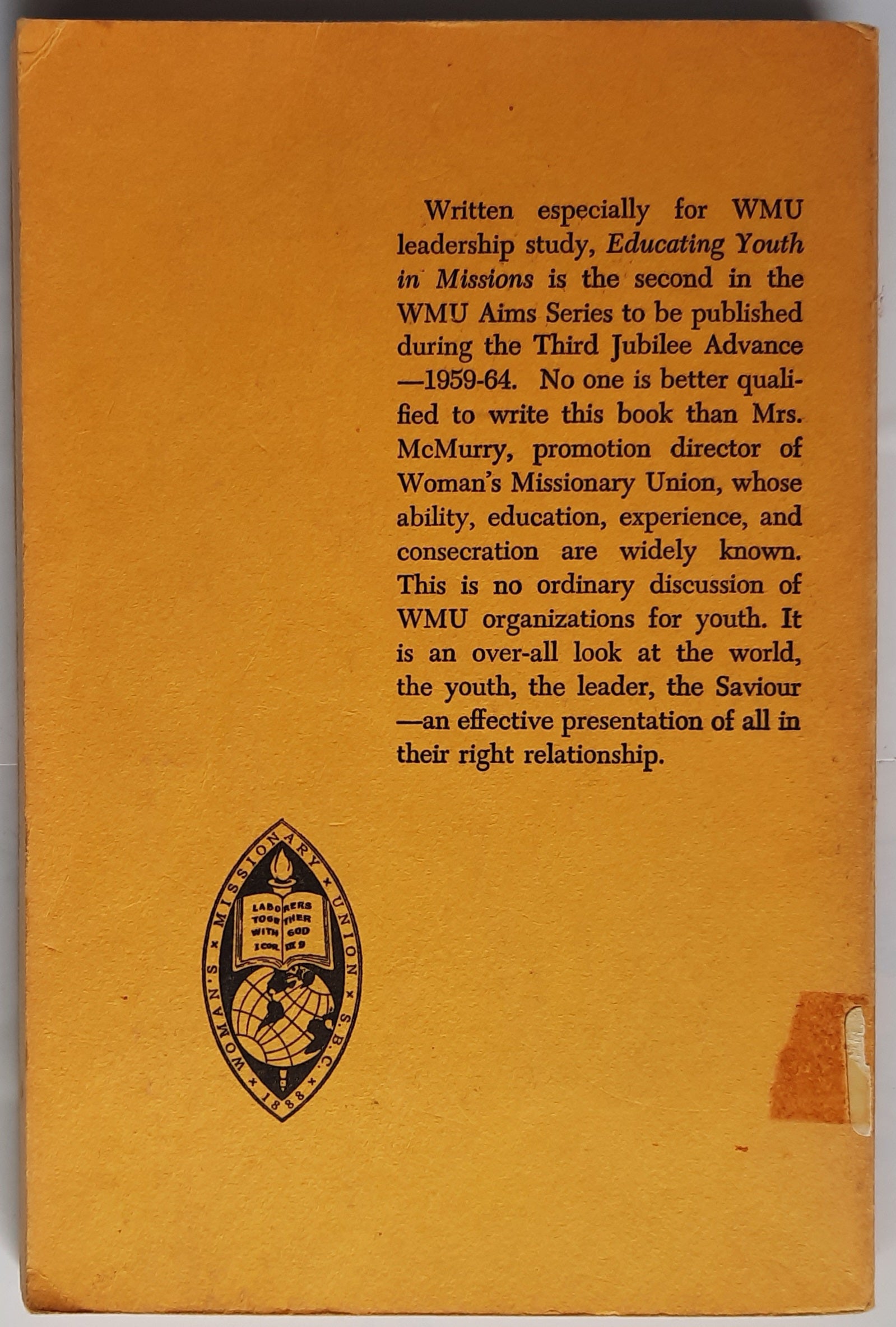 Written especially for WMU leadership study, Educating Youth in Missions is the second in the WMU Aims Series to be published during the Third Jubilee Advance 1959-1964. No one is better qualified to write this book than Mrs. McMurry, promotion director of Woman's Missionary Union, whose ability, education, experience, and consecration are widely known. This is no ordinary discussion of WMU organizations for youth. It is an over-all look at the world, the youth, the leader, the Saviour - an effective presentation of all in their right relationship.