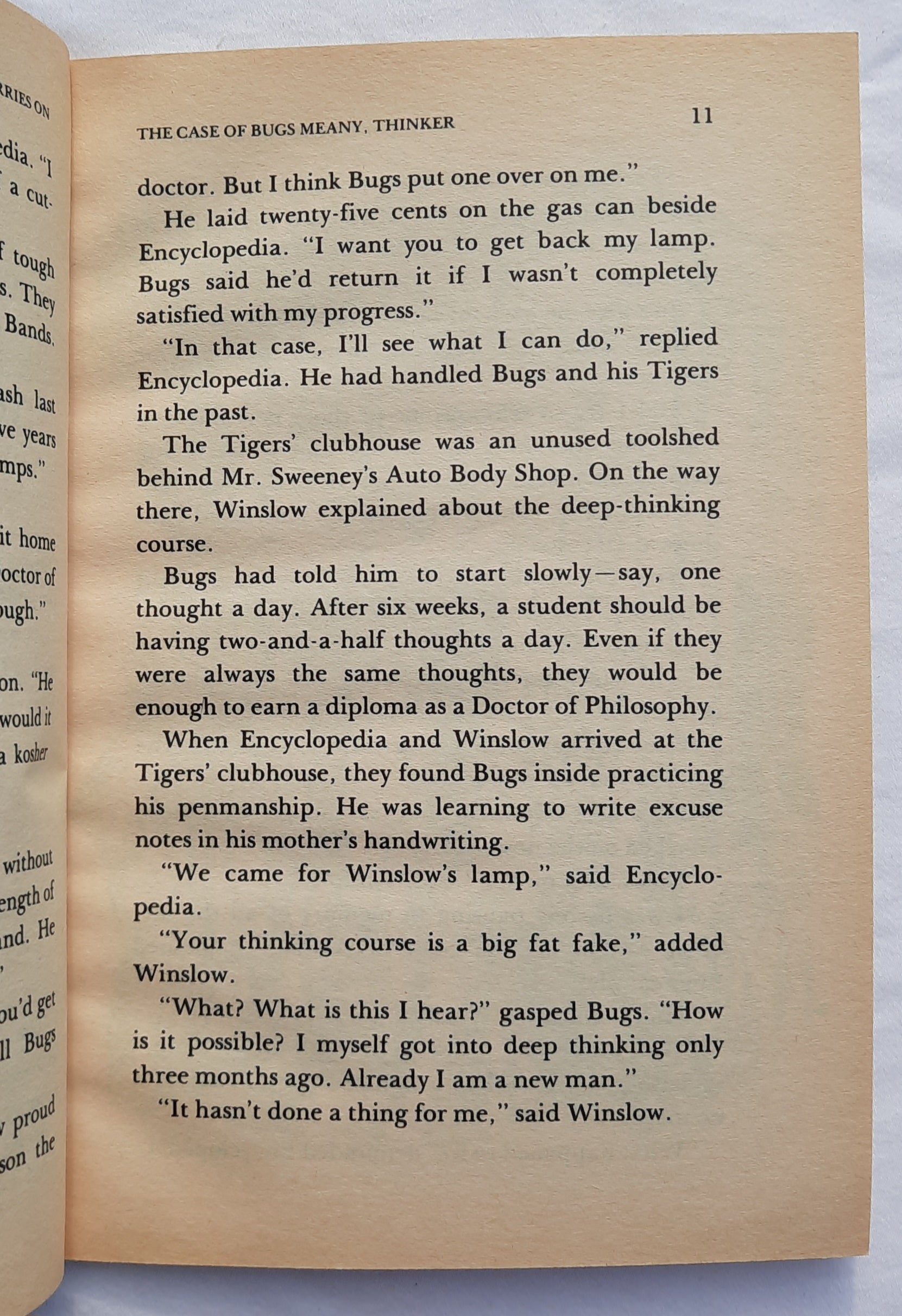 The town's ten-year-old walking encyclopedia again solves ten neighborhood mysteries. The final solution to the cases are at the back of the book, giving the reader a chance to compare his or her skill to that of Encyclopedia Brown.