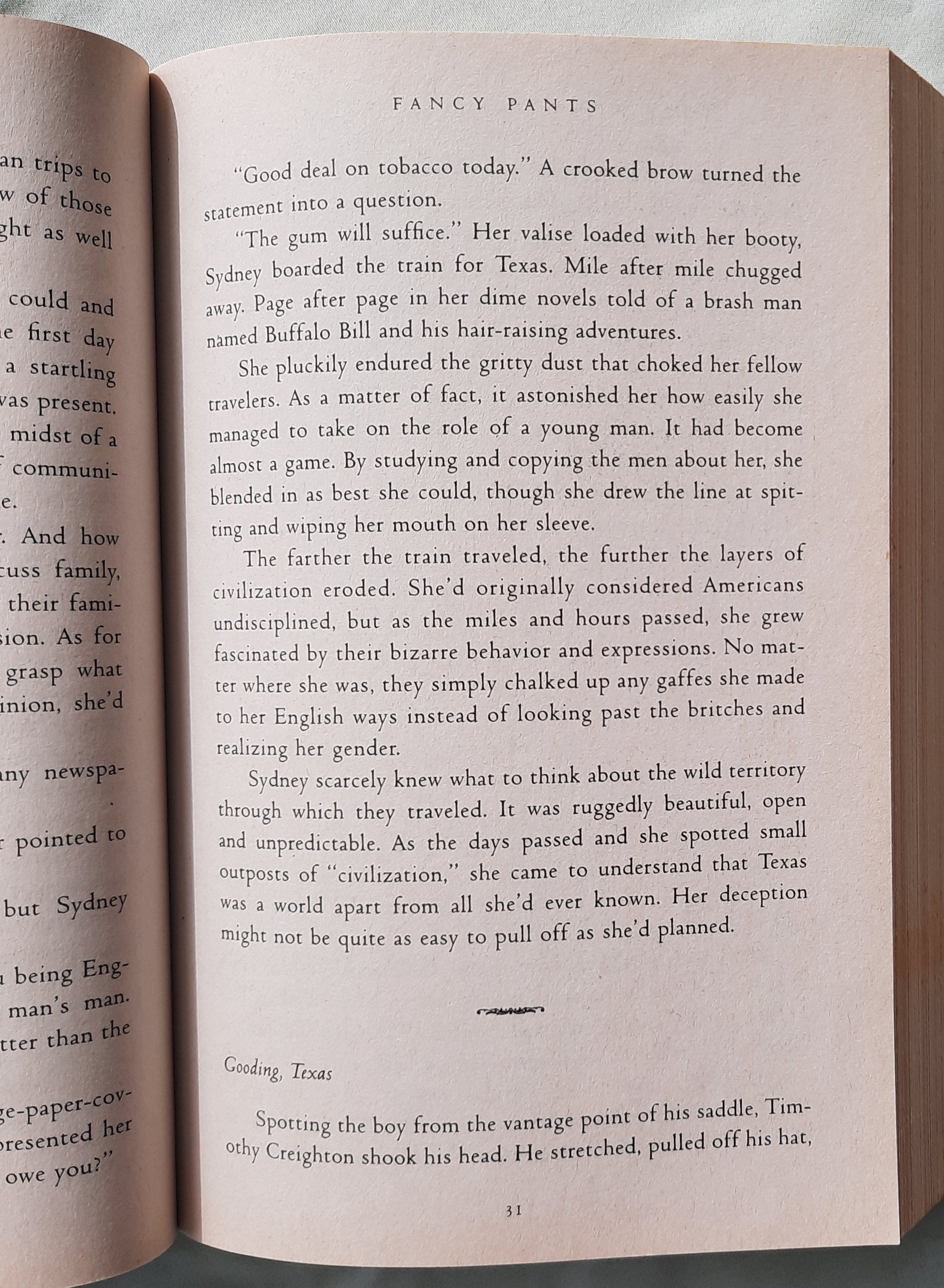 When 17-year-old Lady Sydney Hathwell arrives in 1890 New York City, she never imagines she'll soon be galloping about the Wild West, unchaperoned - and dressed as a man. Honoring her father's dying wish, Sydney journeys from England to consider marrying Manhattan businessman Rexall Hume. After finding him unsuitable, she reveals her verdict. But with Hume insisting on marrying her anyhow, she seeks refuge with her estranged uncle. Disguising herself as an Englishman, Sydney flees the city on a westbound train. But when it's clear her uncle has no use for a female on his Texas ranch, "nephew Fancy Pants" continues the ruse. As unexpected developments unfold, Sydney fears her deception may jeopardize friendship, family, and much more.