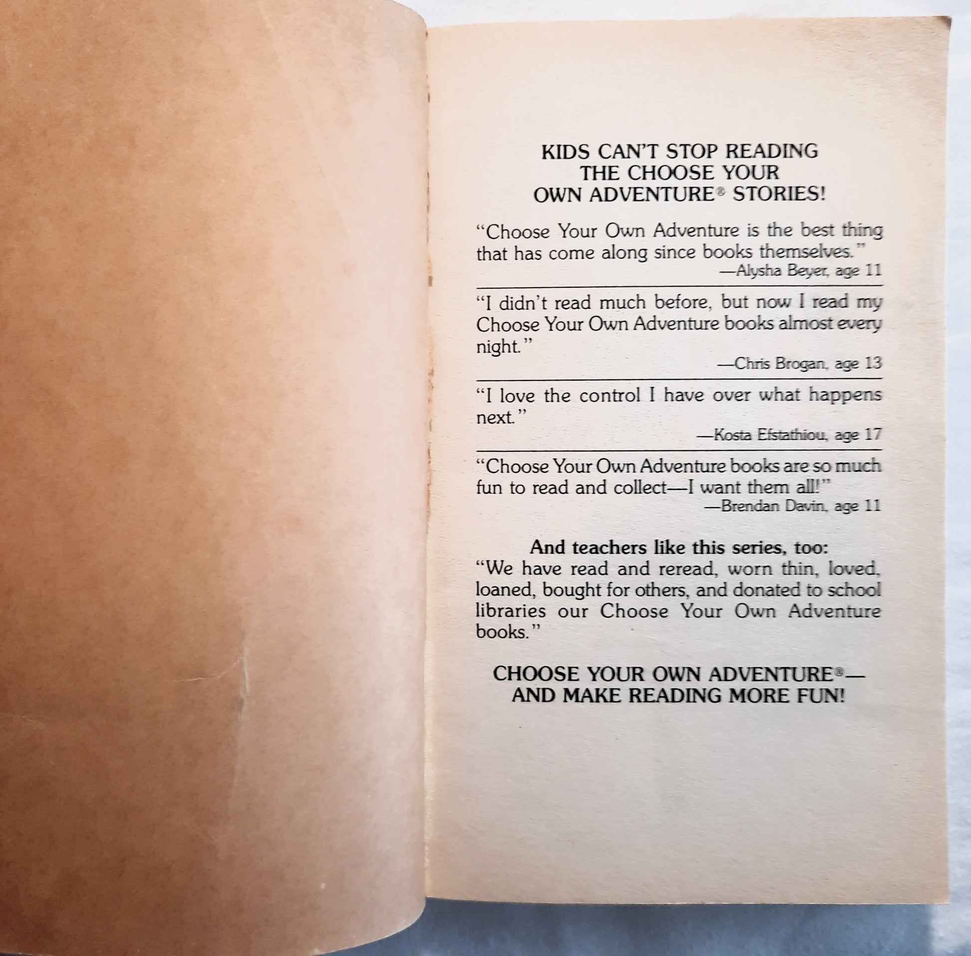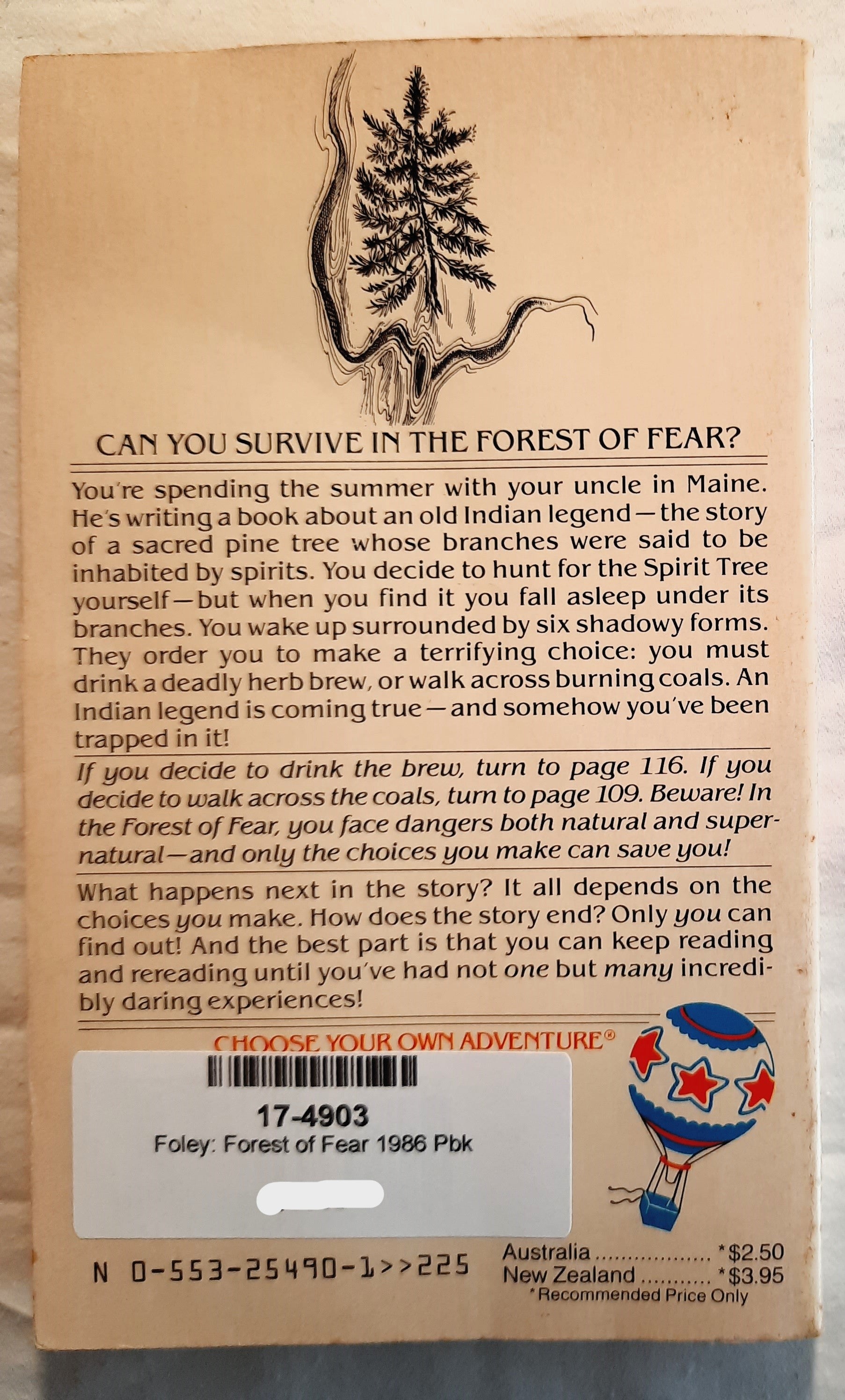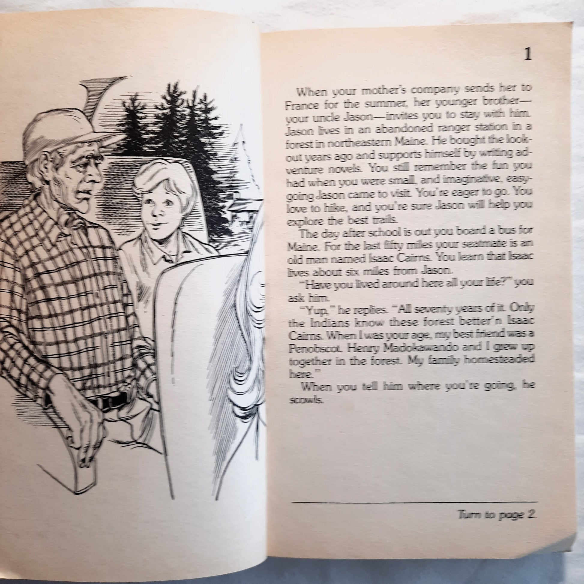You're spending the summer with your uncle in Maine. He's writing a book about an old Indian legend - the story of a sacred pine tree whose branches were said to be inhabited by spirits. You decide to hunt for the Spirit Tree yourself - but when you find it you fall asleep under its branches. You wake up surrounded by six shadowy forms. They order you to make a terrifying choice: you much drink a deadly herb brew or walk across burning coals. An Indian legend is coming true - and somehow you've been trapped in it!