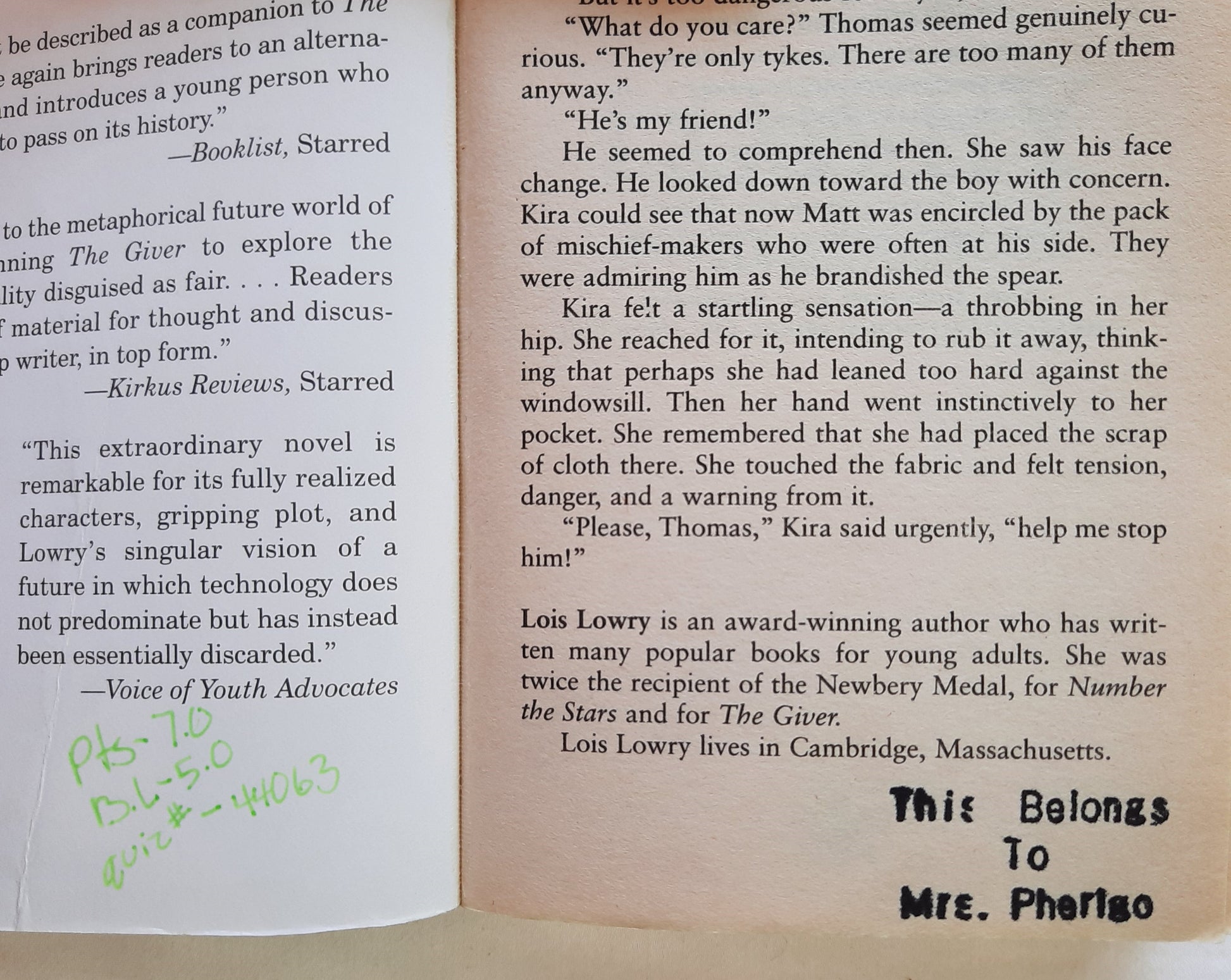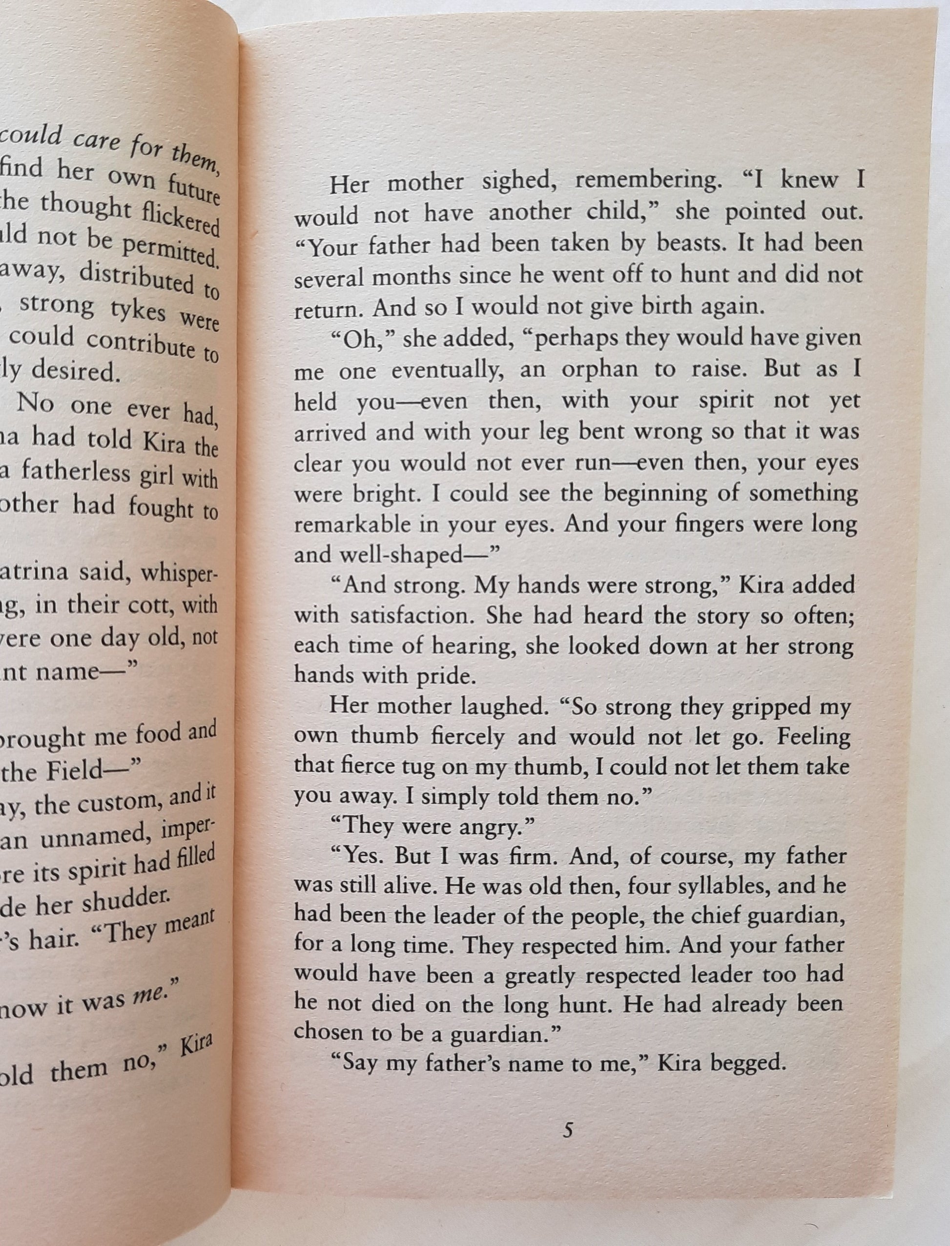 Kira, an orphan with a twisted leg, lives in a world where the weak are cast aside. She fears for her future until she is spared by the all-powerful Council of Guardians. Kira is a gifted weaver and is given a task that no other community member can do. While her talent keeps her alive and brings certain privileges, Kira soon realizes she is surrounded by many mysteries and secrets. No one must know of her plans to uncover the truth about her world and see what places exist beyond.