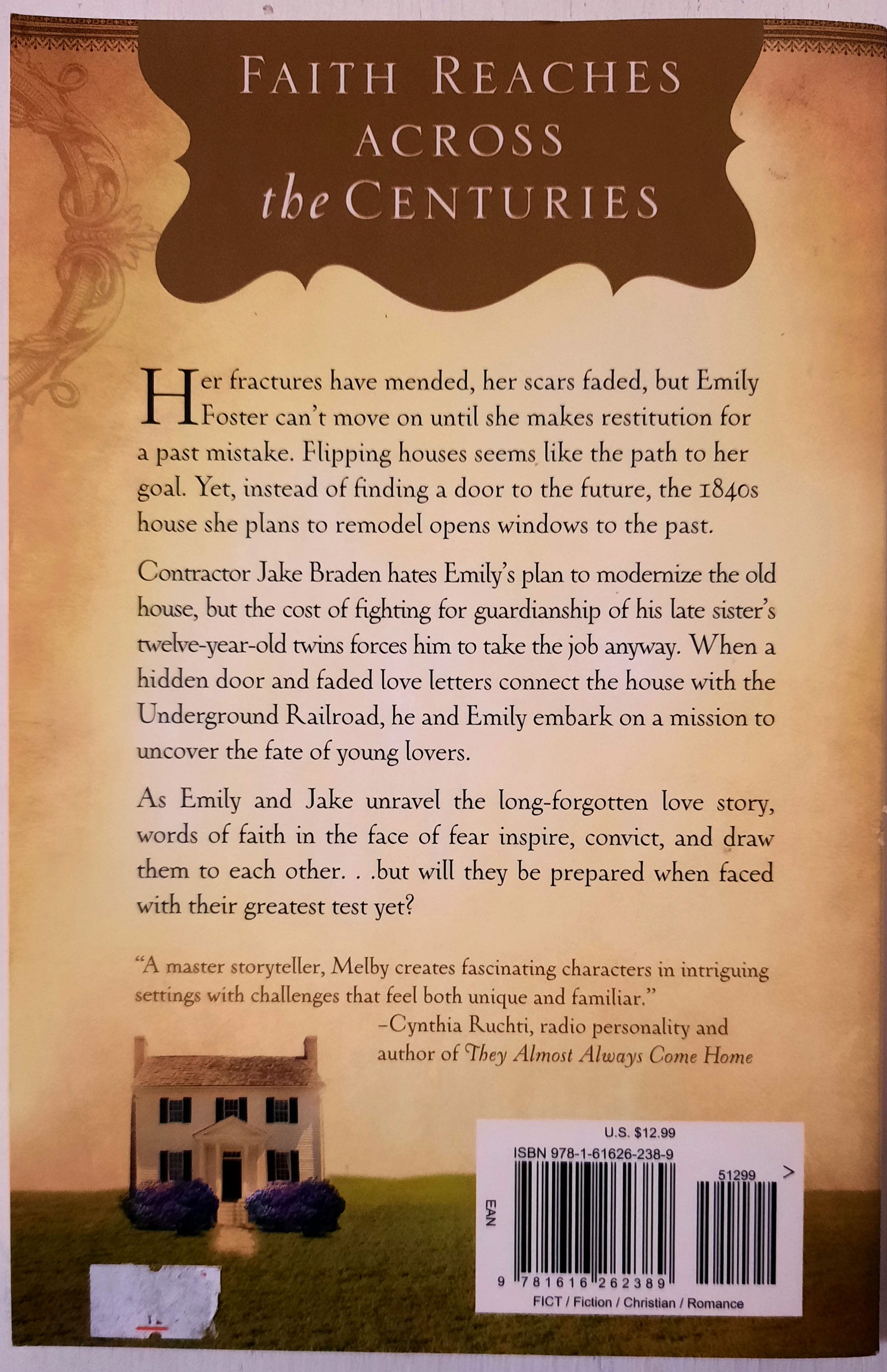 Emily Foster won’t allow herself to move on until she earns enough money to make restitution for the accident that stole a young girl’s dreams. Flipping houses sounds like the fast track to her goal, but when her first project turns out to be a stop on the Underground Railroad, Emily finds herself drawn to, but at odds with, the contractor she hires. Jake Braden needs to focus on gaining guardianship of his late sister’s twins, but the story of lost love uncovered in Emily’s house sets the stage for what might become his own lost love.