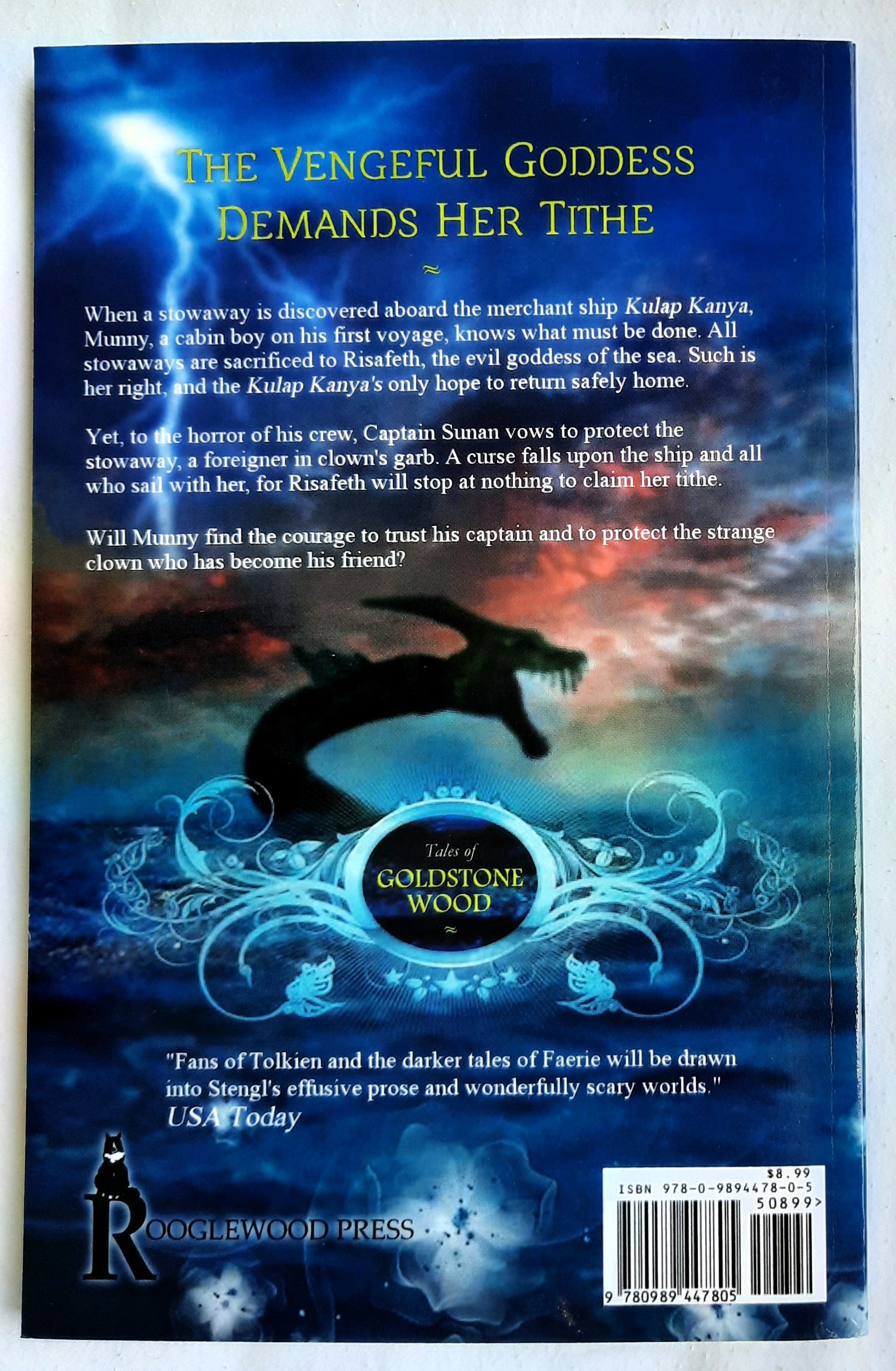 An illustrated novella in the award-winning TALES OF GOLDSTONE WOOD series: The Vengeful Goddess Demands Her Tithe When a stowaway is discovered aboard the merchant ship Kulap Kanya, Munny, a cabin boy on his first voyage, knows what must be done. All stowaways are sacrificed to Risafeth, the evil goddess of the sea. Such is her right, and the Kulap Kanya's only hope to return safely home. Yet, to the horror of his crew, Captain Sunan vows to protect the stowaway, a foreigner in clown's garb. A curse falls upon the ship and all who sail with her, for Risafeth will stop at nothing to claim her tithe. Will Munny find the courage to trust his captain and to protect the strange clown who has become his friend?
