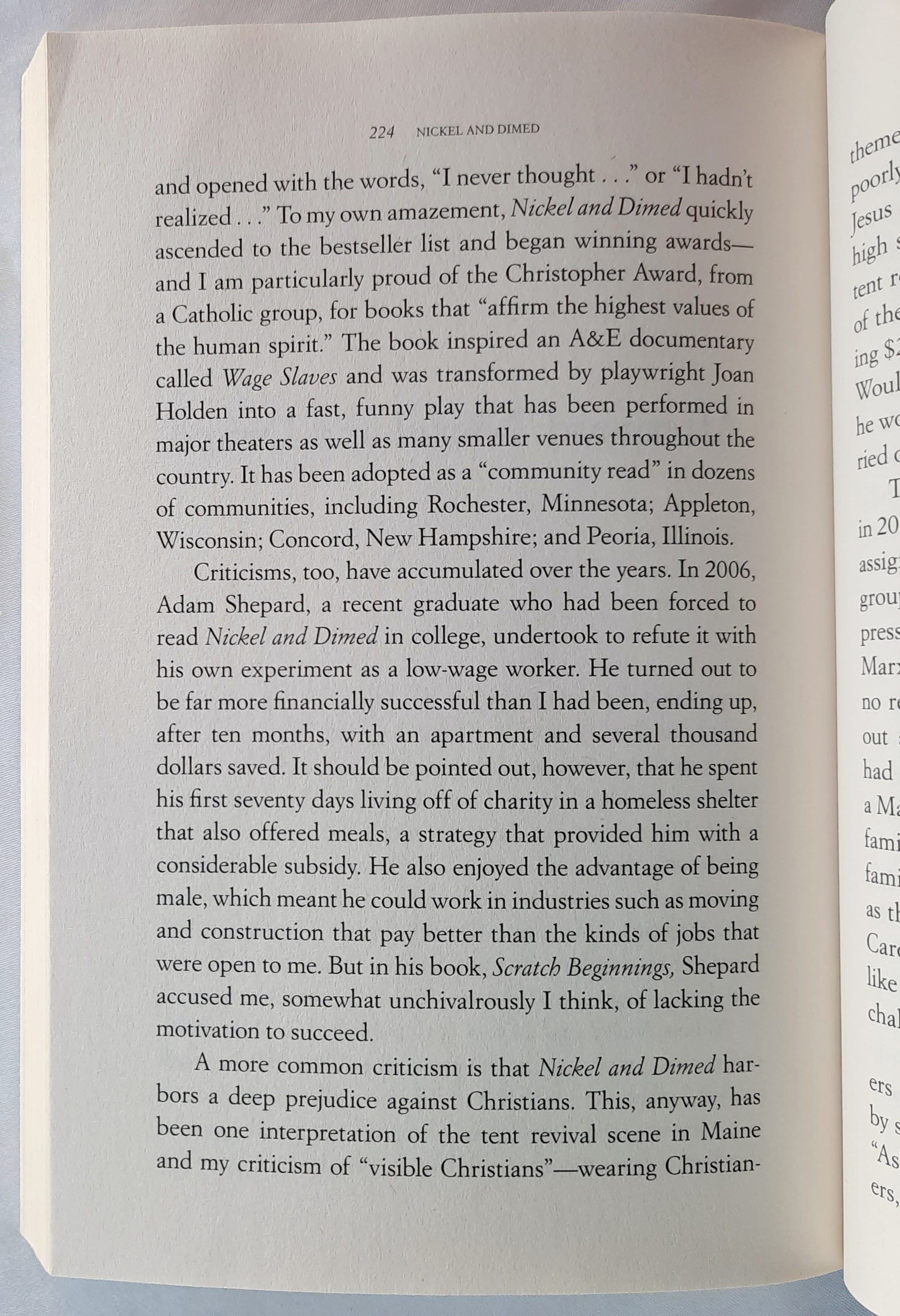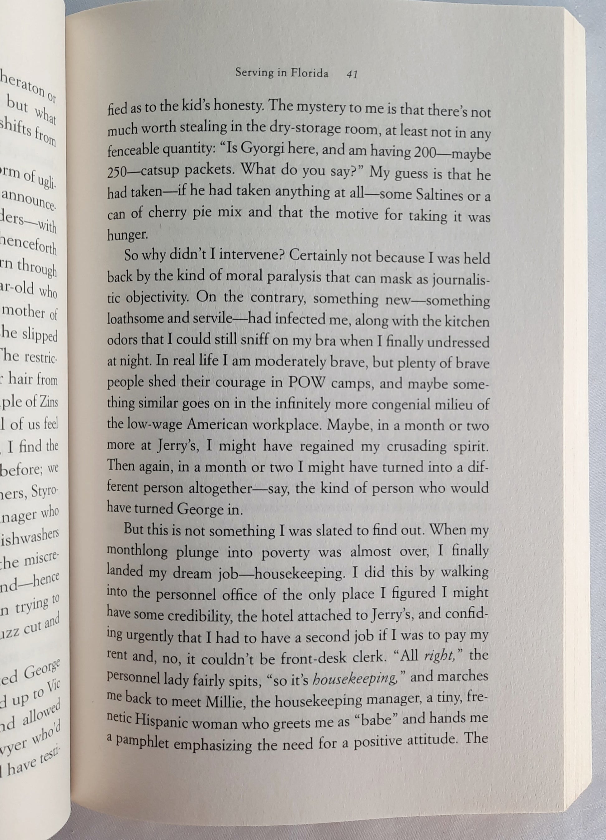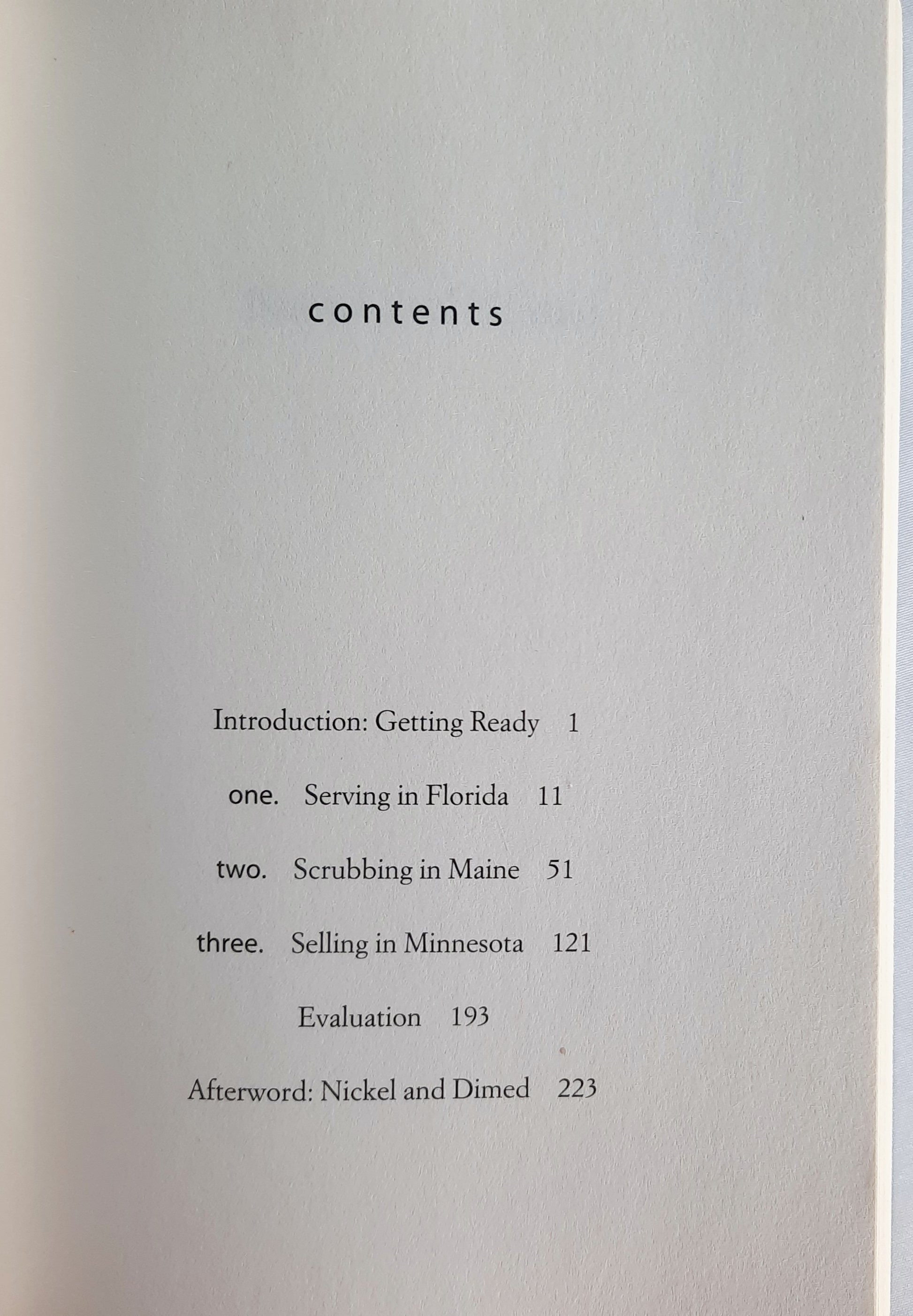 To find out, Ehrenreich left her home, took the cheapest lodgings she could find, and accepted whatever jobs she was offered. Moving from Florida to Maine to Minnesota, she worked as a waitress, a hotel maid, a cleaning woman, a nursing-home aide, and a Wal-Mart salesclerk. She lived in trailer parks and crumbling residential motels. Very quickly, she discovered that no job is truly "unskilled," that even the lowliest occupations require exhausting mental and muscular effort. She also learned that one job is not enough; you need at least two if you int to live indoors.