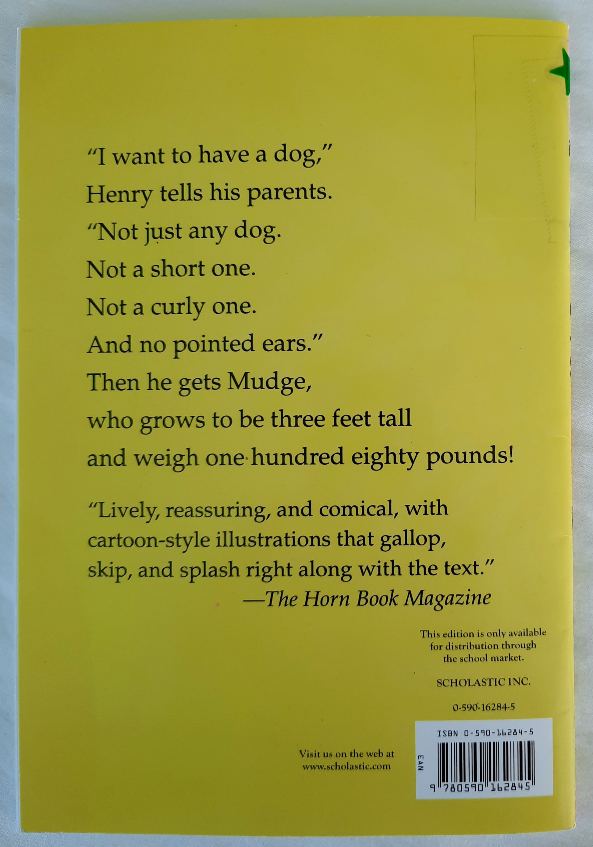 Henry and Mudge The First Book (Very good, 2003, Pbk, 40 pages, Scholastic), ISBN 0590162845) Henry doesn't have any brothers or sisters or friends. What he does have is Mudge, a 180-pound dog who is Henry's best friend and protector. The pair share several adventures in this lighthearted and easy-to-read book. Full-color illustrations.