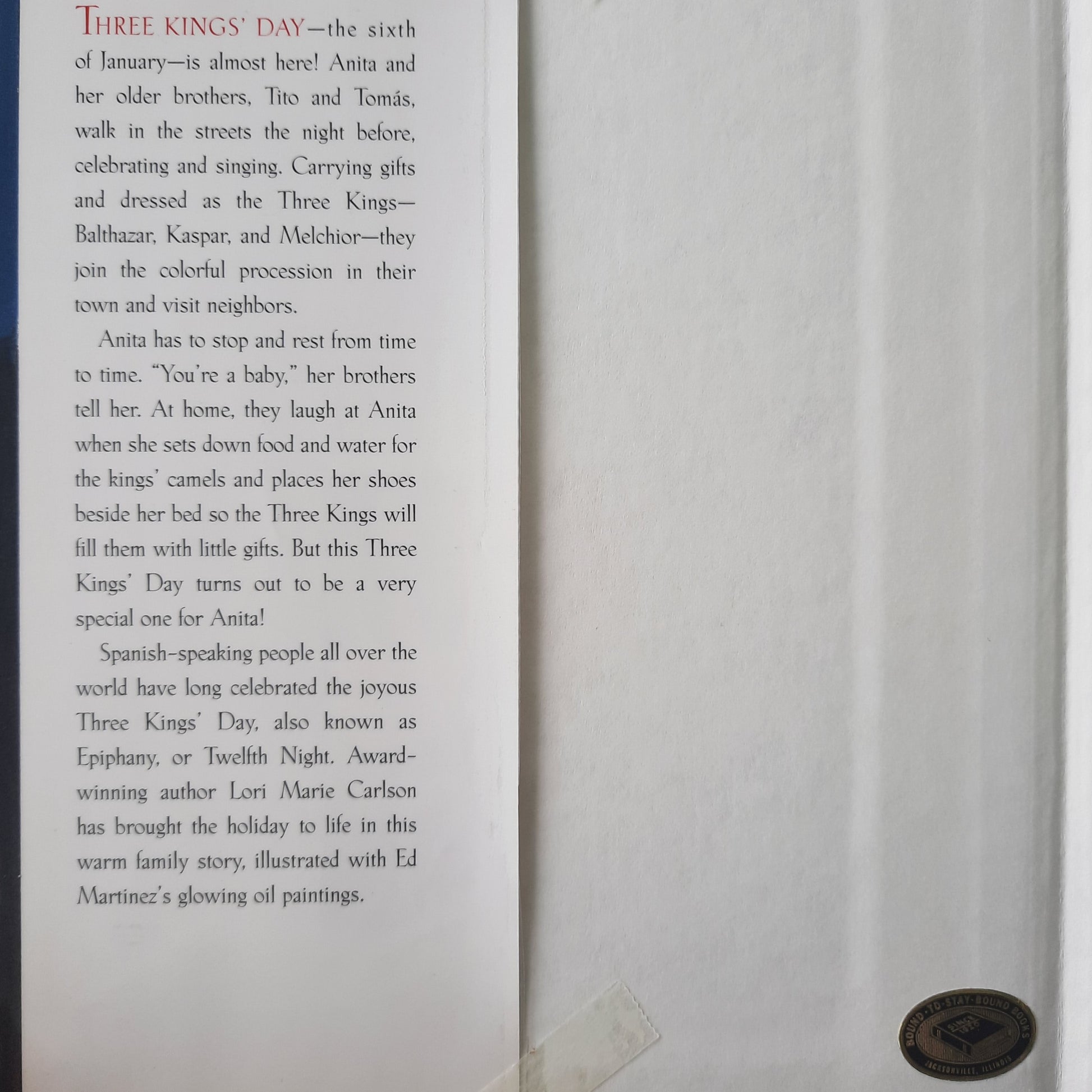 Spanish-speaking people all over the world celebrate the joyous Three Kings' Day - also known as the Epiphany or Twelfth Night - every January sixth. Award-winning author Lori Marie Carlson brings the holiday to life in this engaging family story about three children -- carrying gifts and dressed as Balthazar, Kaspar, and Melchoir - who go from house to house in their neighborhood and reenact the journey of the Three Wise Men. G