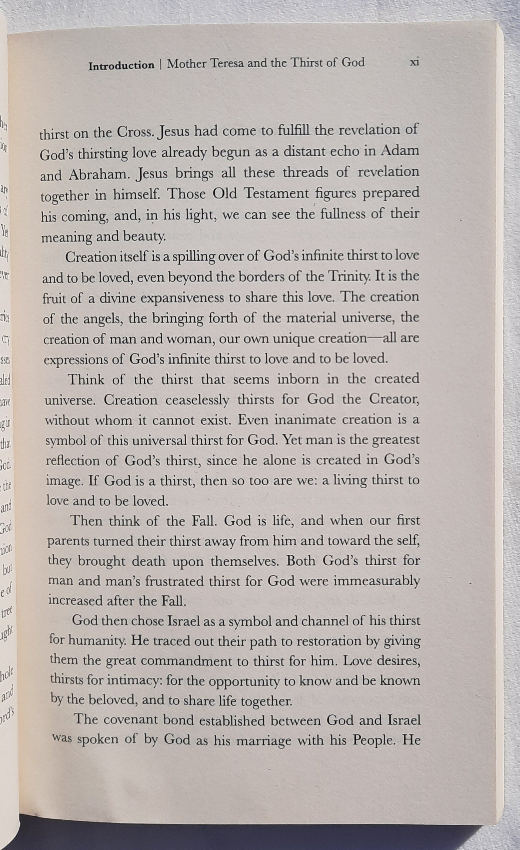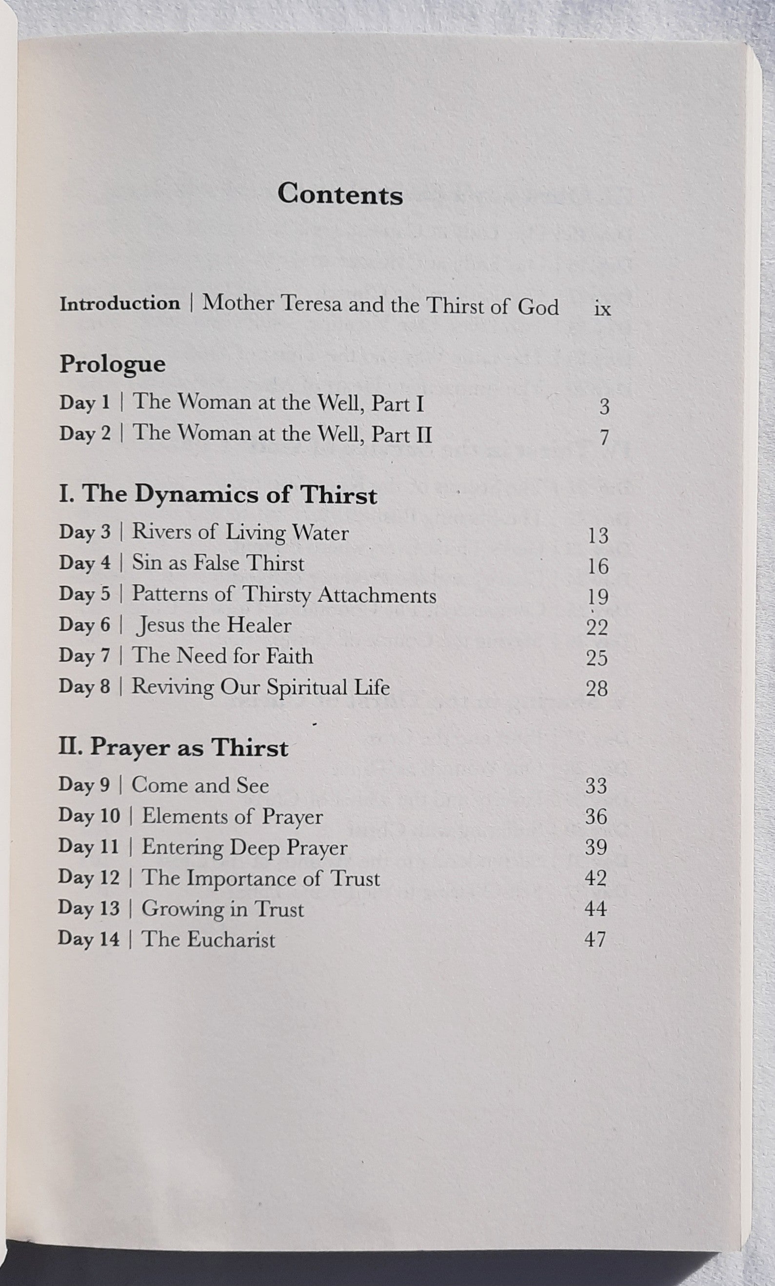 I Thirst provides an opportunity to spend a few minutes every day with Mother Teresa and the thirst of our Lord. It provides an opportunity to grow in intimacy, and to meet the thirst of God with our own thirst for him.