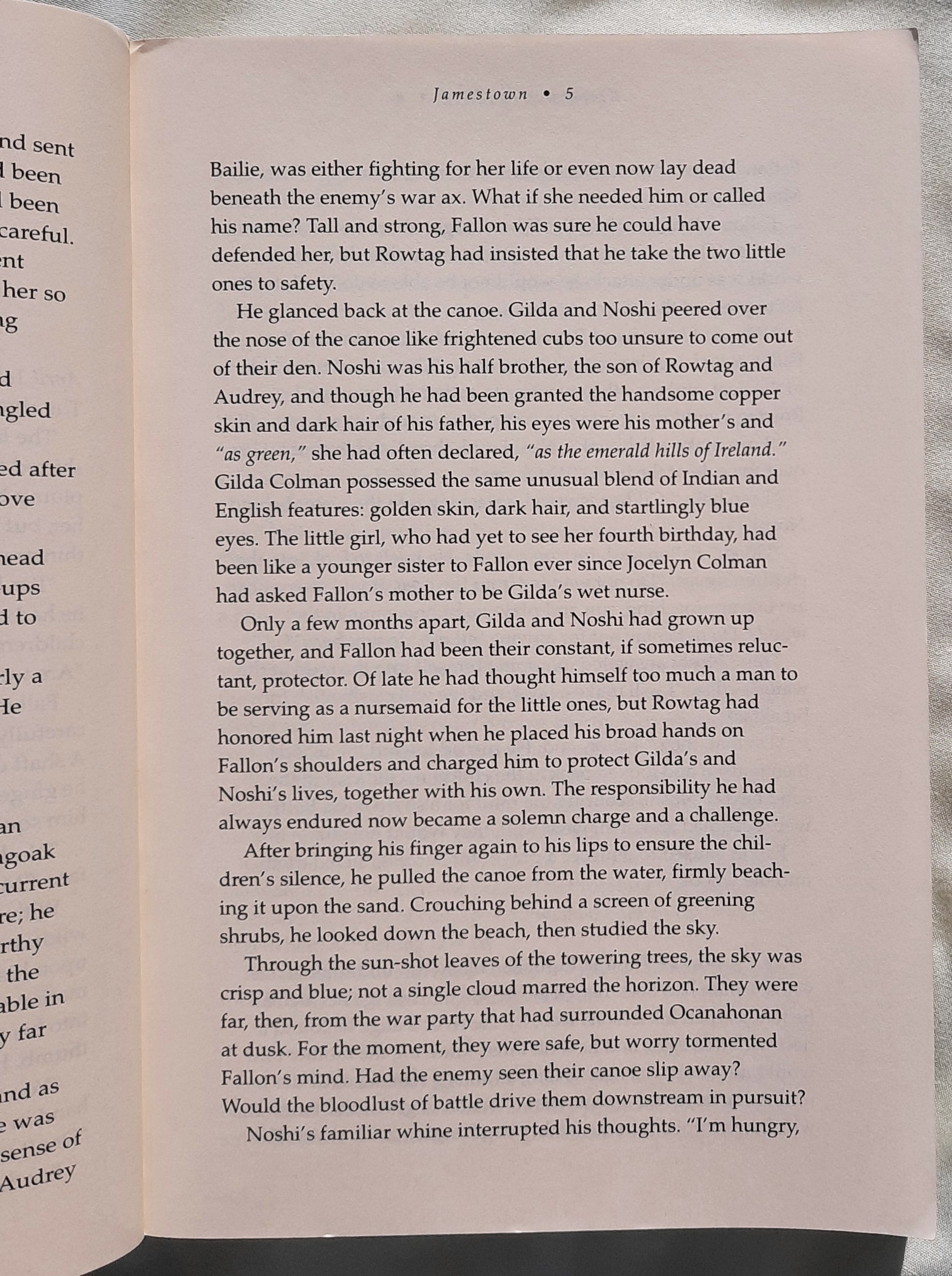 Fallon, the oldest, made a solemn pledge to protect his younger charges at all costs. But before long they are torn apart; Fallon is sentenced to death, saved at the last moment and sent to England; Noshi is sold as a slave; and Gilda is claimed by her cousin, Pocahontas.But Fallon has not forgotten Noshi or Gilda. And so he overcomes all odds to return to America and fulfill his pledge to his murdered parents. But what awaits him is far more treacherous than he dreamed, and those he seeks are far more changed than he could have imagined.