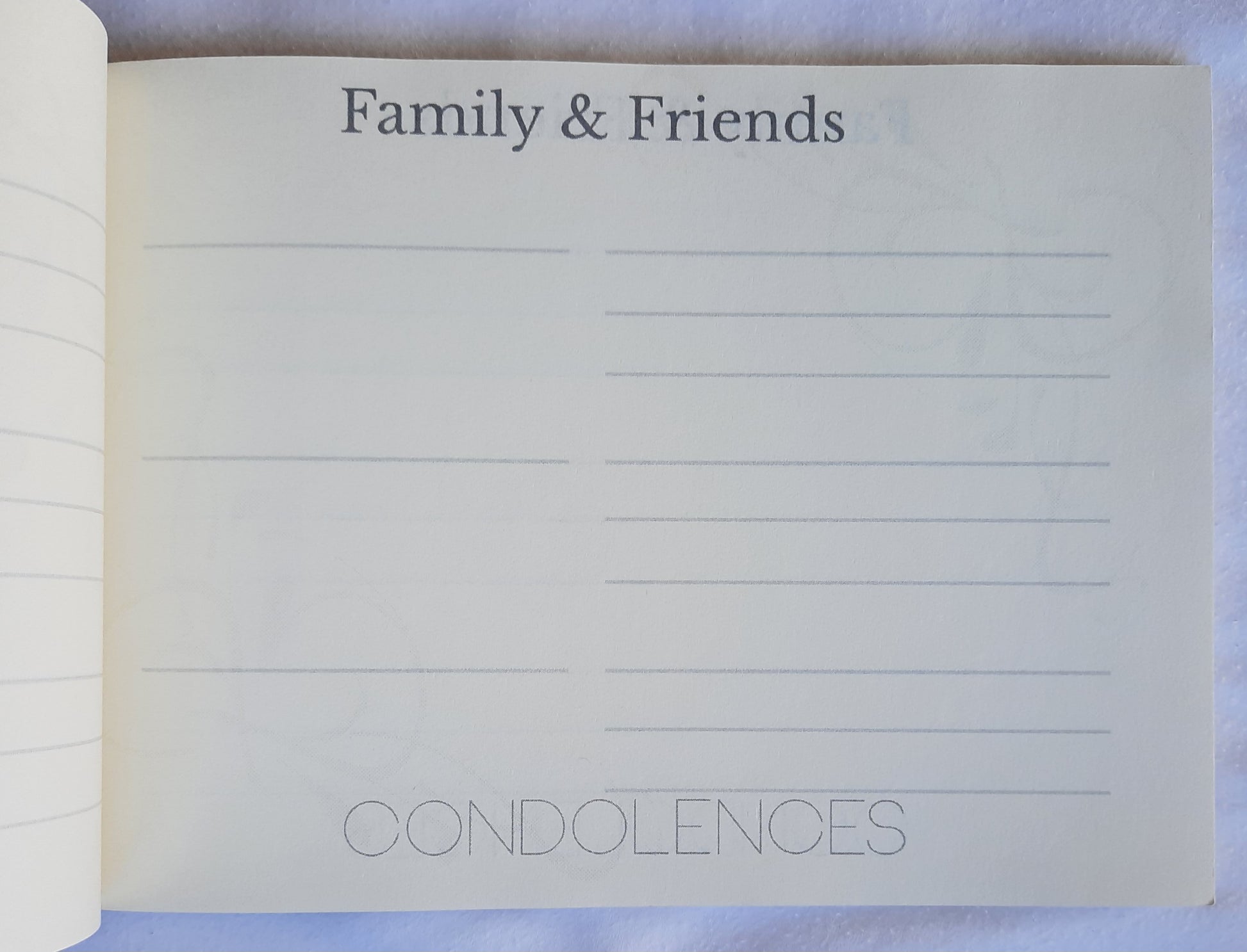 - Each Page is titled with Family and Friends. And the word CONDOLENCES is printed across the bottom with a light gray ink.
