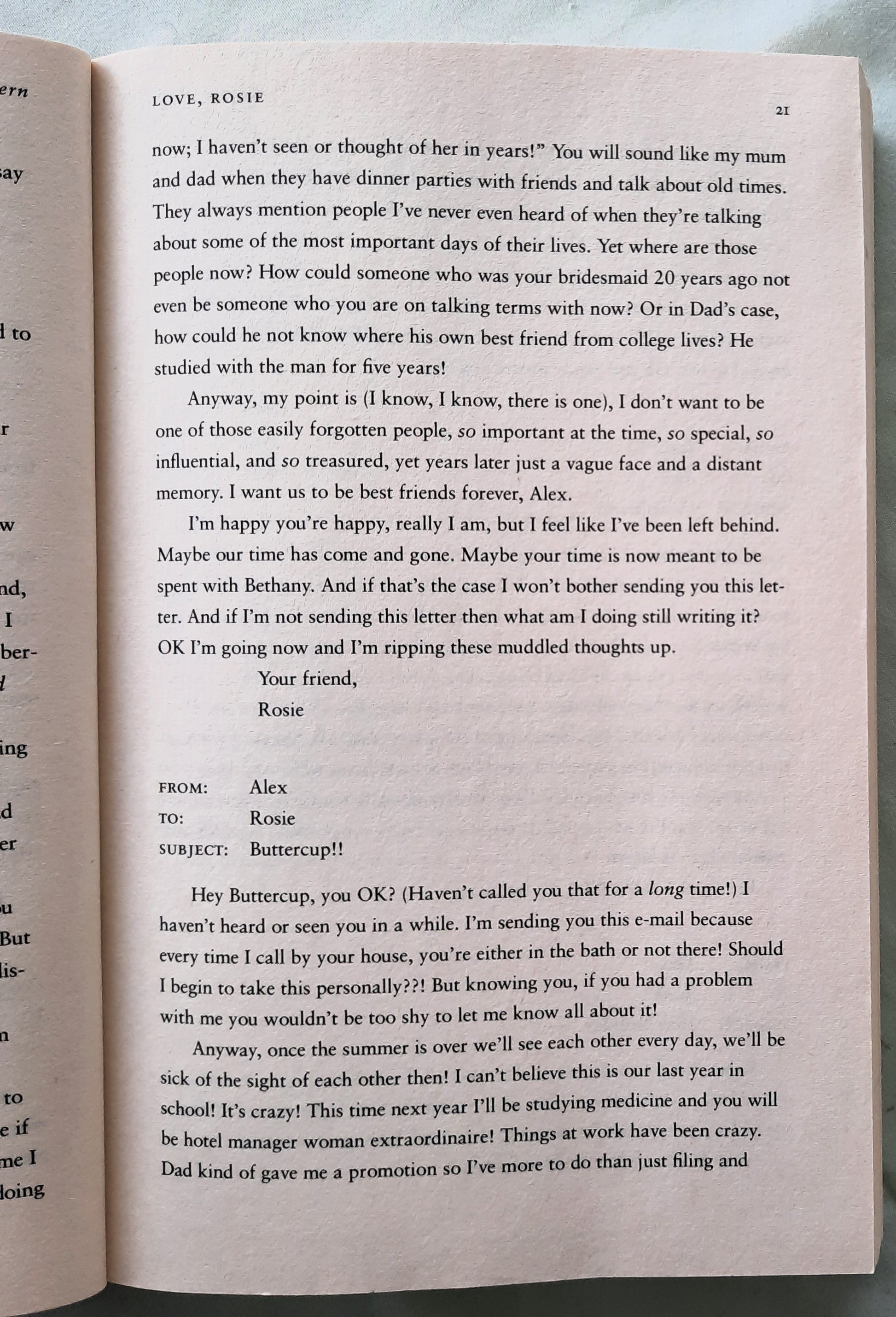 Rosie and Alex are destined for each other, and everyone seems to know it but them. Best friends since childhood, they are separated as teenagers when Alex and his family relocate from Dublin to Boston.