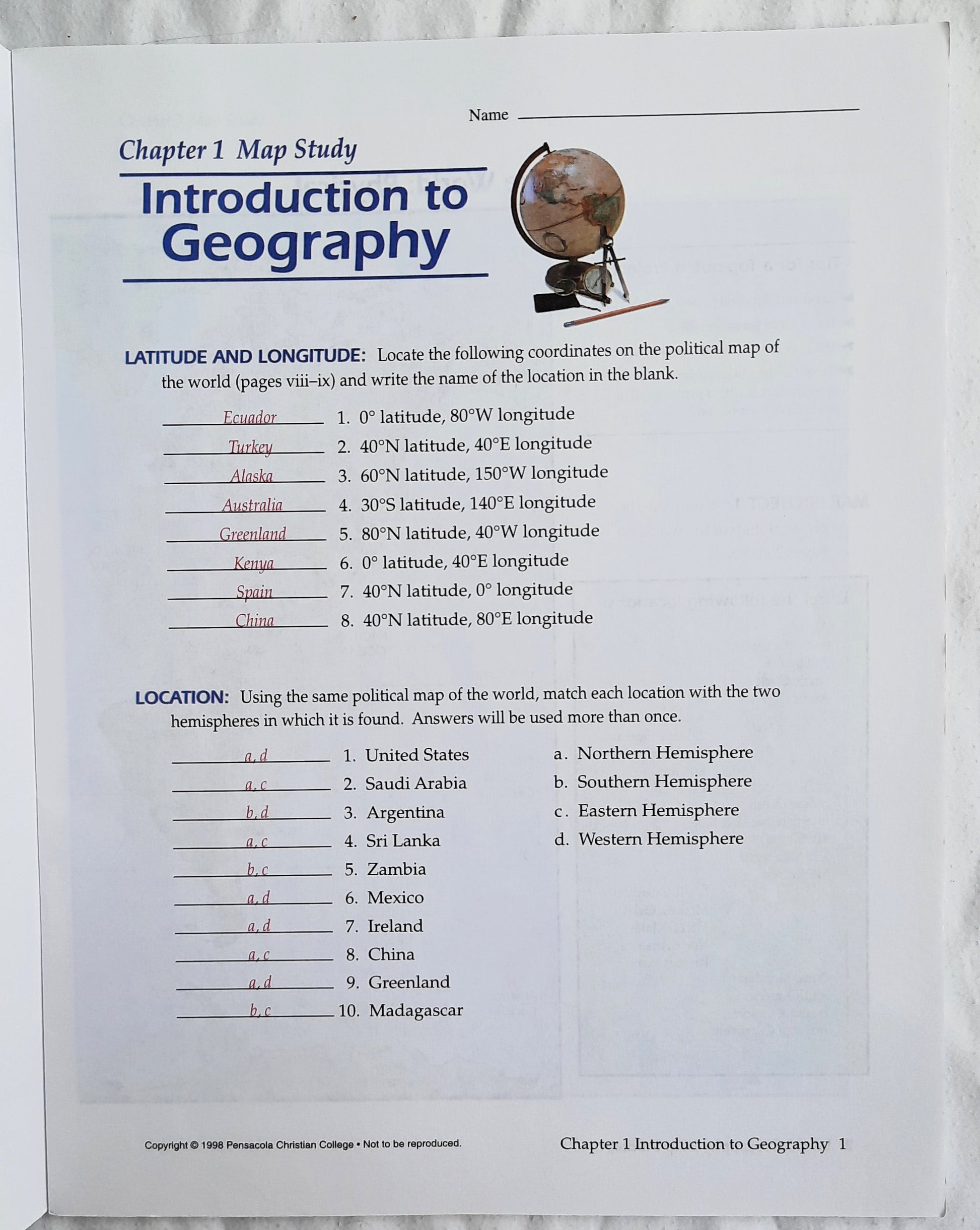 World Geography Map Studies is designed to be used with the World Geography textbook. These Map Studies are coordinated with the maps in the text for the reinforcement of map skills and geographic knowledge. Each project gives students valuable practice in locating political and geographic features and includes questions which review the facts presented in World Geography. These projects are assigned in the daily plans provided in the Teacher Guide.