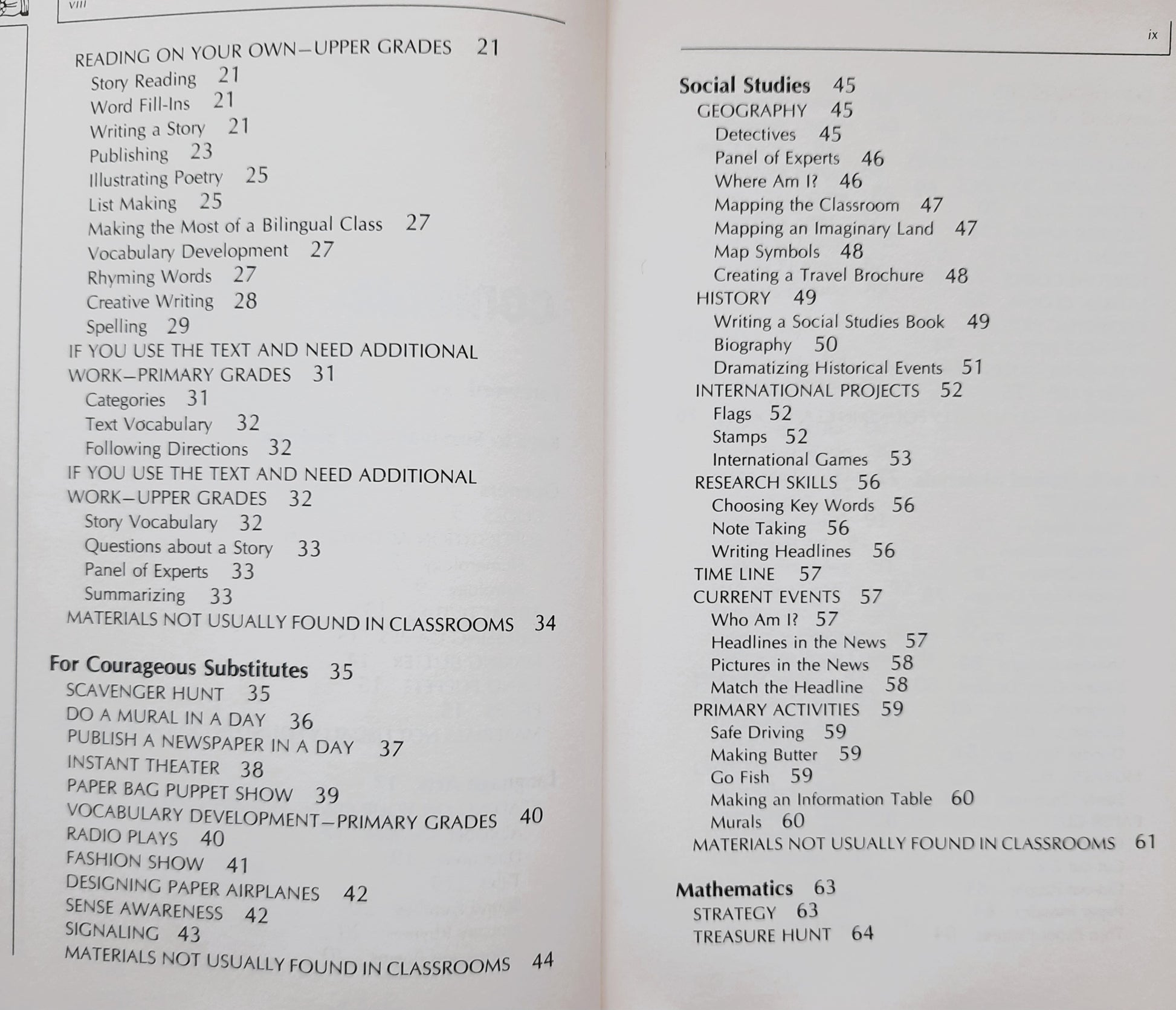 OR you can turn the regular teacher's absence into a special opportunity - for you and the children. you can introduce new activities...games that review basic skills...projects that integrate subject areas.