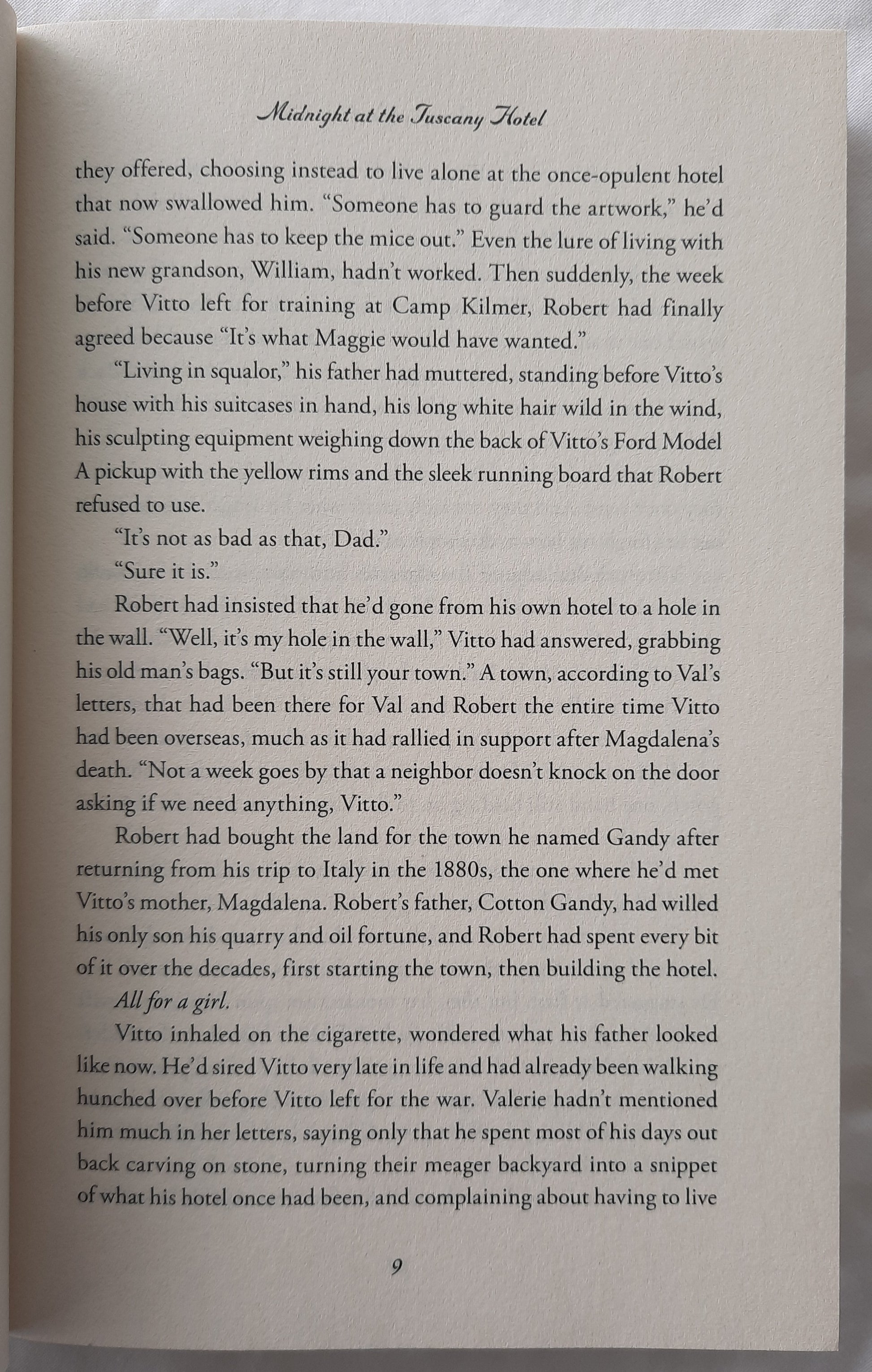 After thirteen months at war, Vittorio Gandy is haunted by memories, and his former life is unrecognizable. Once a gifted painter, now he can’t bear the vivid, bleeding colors on a canvas. His young son doesn’t remember him, and his wife, Valerie, is scared of him. But the most disconcerting change is in Vitto’s father, Robert Gandy, who has fallen from being a larger-than-life sculptor to a man whose heart has been broken by the death of his muse—Vitto’s mother—and whose mind has been taken by Alzheimer’s.