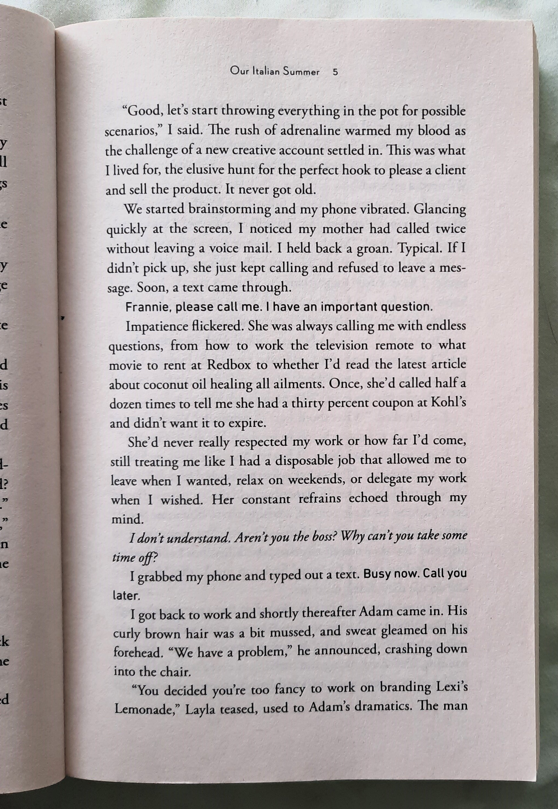 Workaholic, career-obsessed Francesca is fiercely independent and successful in all areas of her life except one: family. She struggles to make time for her relationship with her teenage daughter, Allegra, and the two have become practically strangers to each other. When Allegra hangs out with a new crowd and is arrested for drug possession, Francesca gives in to her mother's wish that they take one epic summer vacation to trace their family roots in Italy. She just never expected to face a choice that might change the course of her life. . .