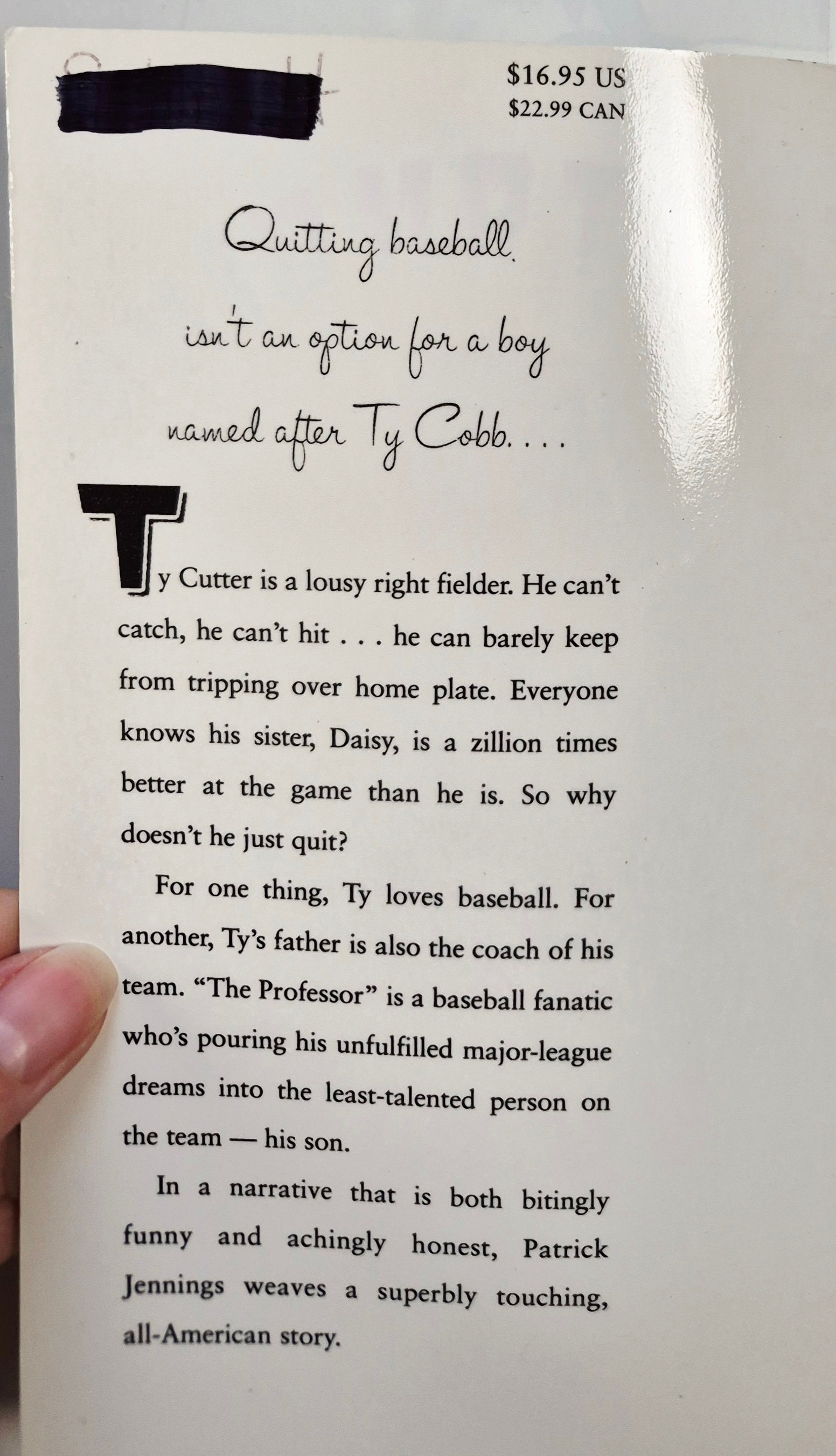 Ty has been named for baseball legend Ty Cobb, but the hero of Jennings' wonderful new novel isn't living up to his namesake's reputation when it comes to The Game. He loves baseball; he just isn't great at it, despite all the efforts of his coach and father, who himself once dreamed of playing in the majors. To complicate matters, Ty's younger sister Daisy is a baseball whiz (as well as the school genius). In this sharply witty, deeply poignant all -American novel, Ty has to figure out just who he's trying to please -- his father, his teammates, or himself.