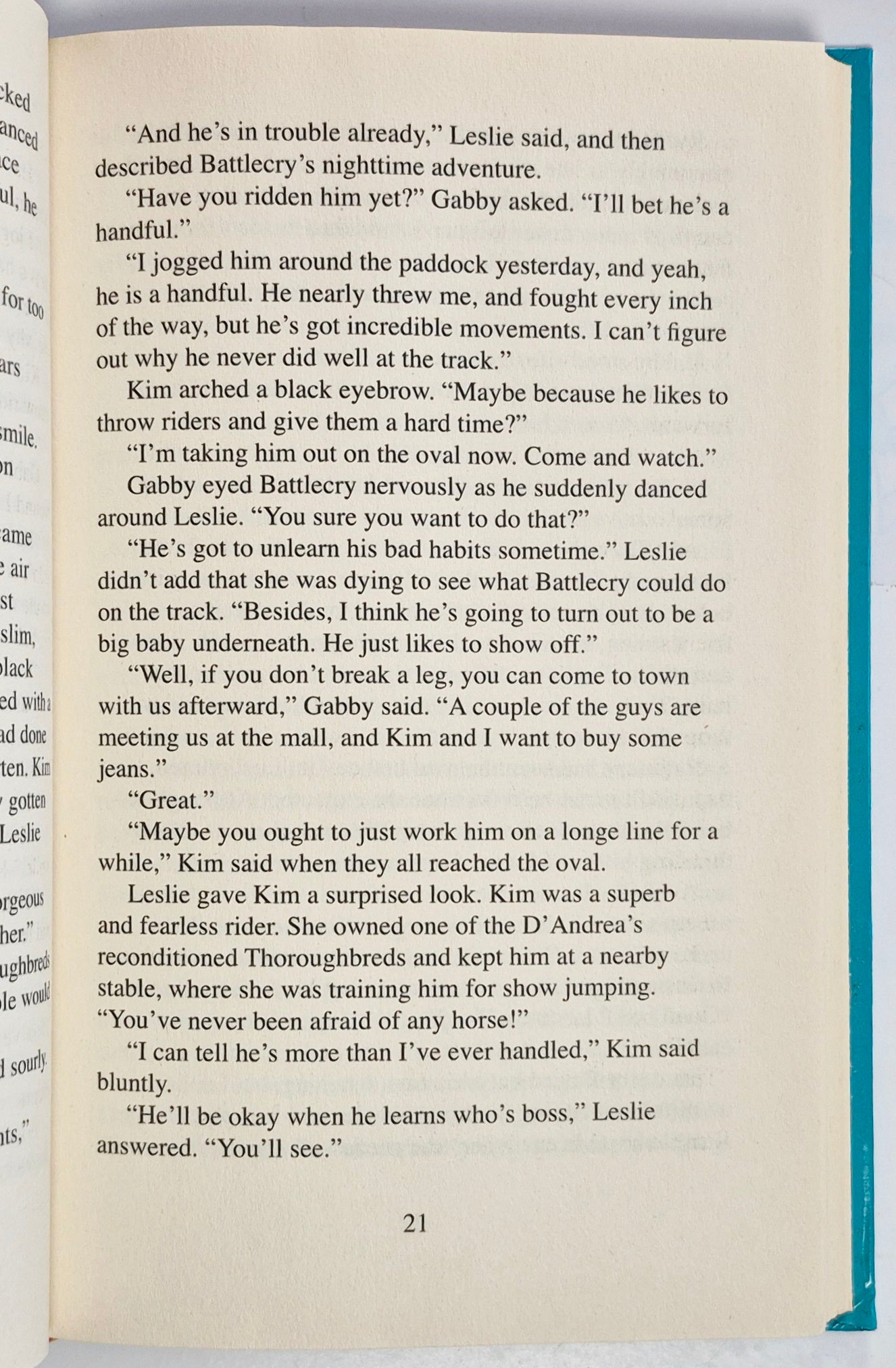 Fifteen-year-old Leslie D'Andrea can have any horse she wants—her parents own stables where they train retired Thoroughbreds to become pleasure riders. But the only horse Leslie wants is Battlecry, a racer everyone else has given up on as wild and untrainable.