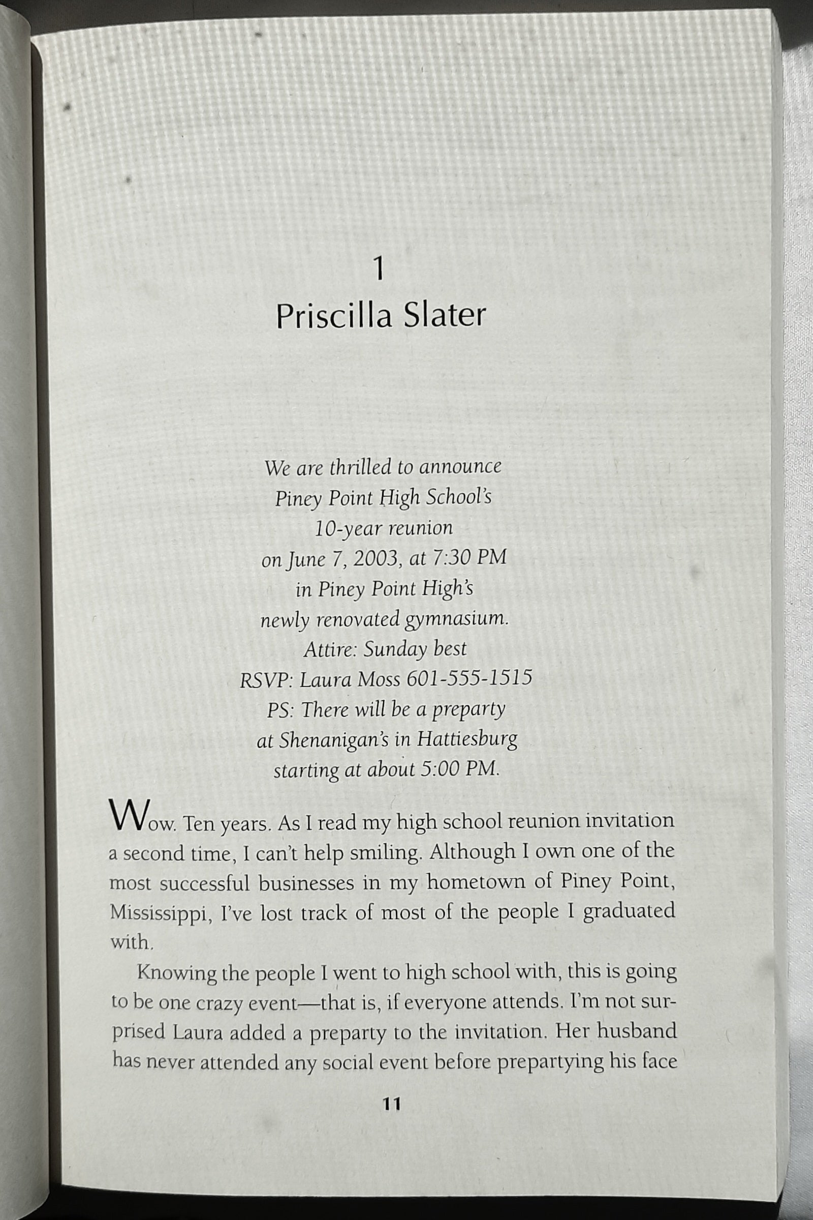 Priscilla Slater goes to her ten-year high school reunion with equal parts dread and eager anticipation. Even though she’s a successful owner of a chain of hair salons and no longer has the mousy brown hair, crooked teeth, and discount-store wardrobe, she still feels like the ugly duckling. But when she arrives at the reunion, Priscilla soon realizes that her old classmates aren’t exactly as she remembers them. With humor and a just a touch of sassiness, Priscilla finds herself facing her own truth―and she may be surprised at what she discovers.