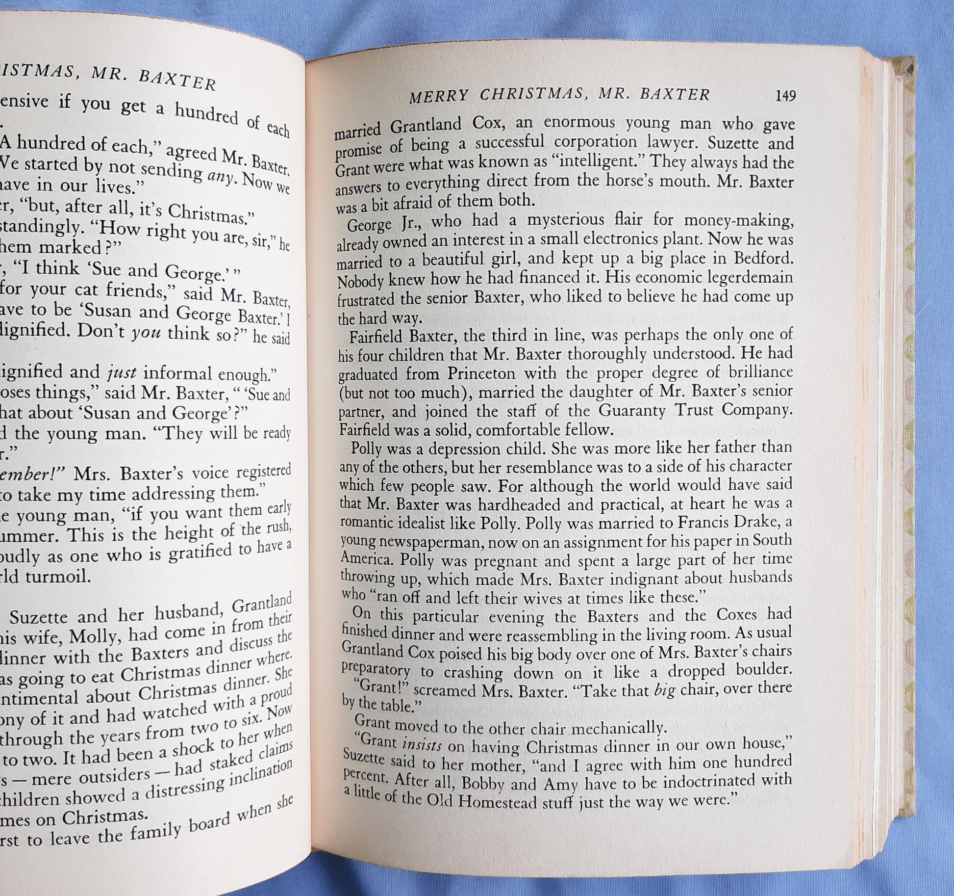 Merry Christmas, Mr. Baxter by Edward Streeter: George Barton Baxter, the successful CEO of a New York textile house is returning to his Park Avenue apartment from work one mid-October evening. His thoughts turn to the onset of cooler weather, which will bring Christmas around once again. He considers the economic impact on his personal finances grimly, and upon arriving home, he takes a short rest before dinner, fantasizing about the type of gifts he would really like, but which he knows are impossible pipe dreams. He also reflects briefly on the gifts he will likely receive - none of which he really needs or will use. At dinner that evening, he discusses a "Christmas Budget" with his wife, who considers the idea ridiculous - but Mr. Baxter persists.