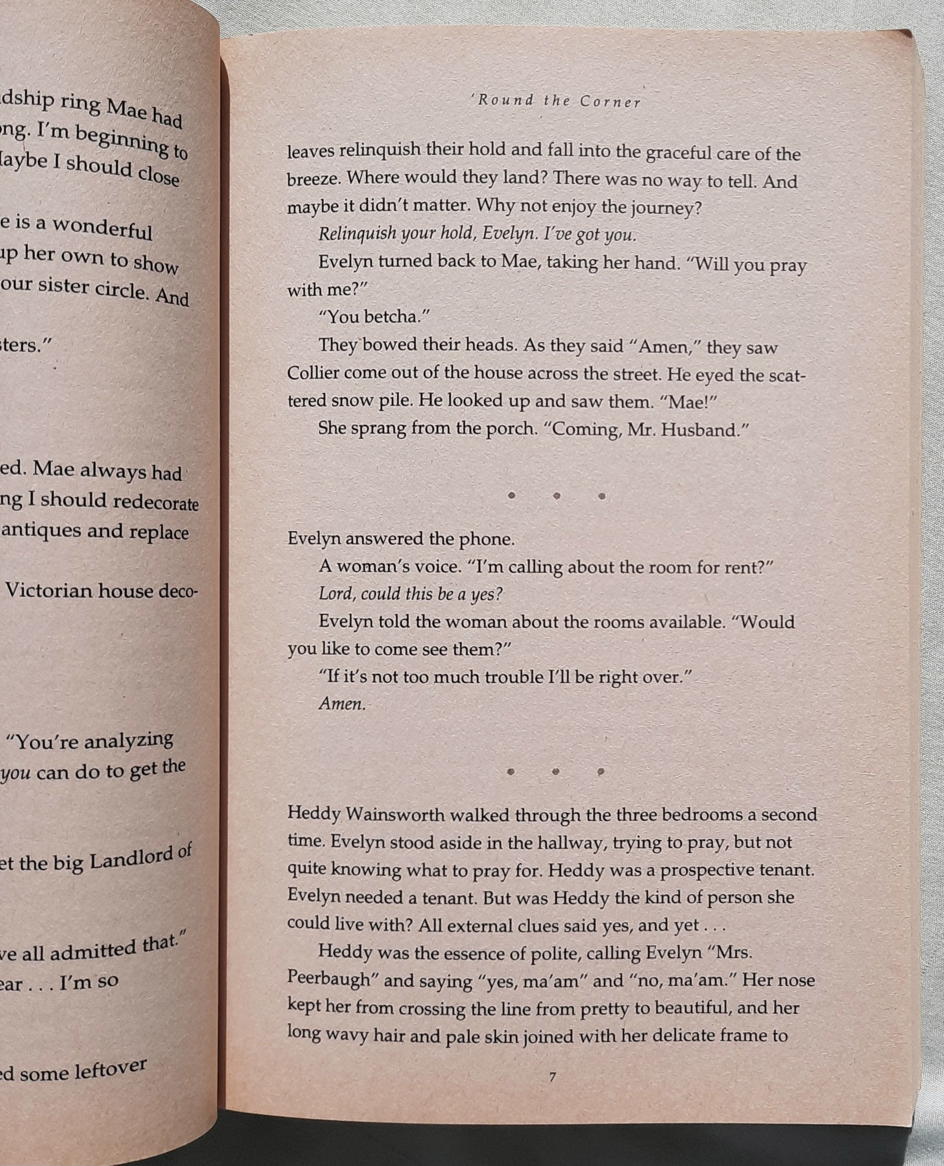 "Round the Corner", Book Two of this charming contemporary series, continues the timeless, heartwarming story of Peerbaugh Place, the quaint Victorian house that becomes a refuge to women of vastly different ages, personalities, and backgrounds. Through struggles and triumphs, the women forge a special bond of sisterhood and come together through faith and love.