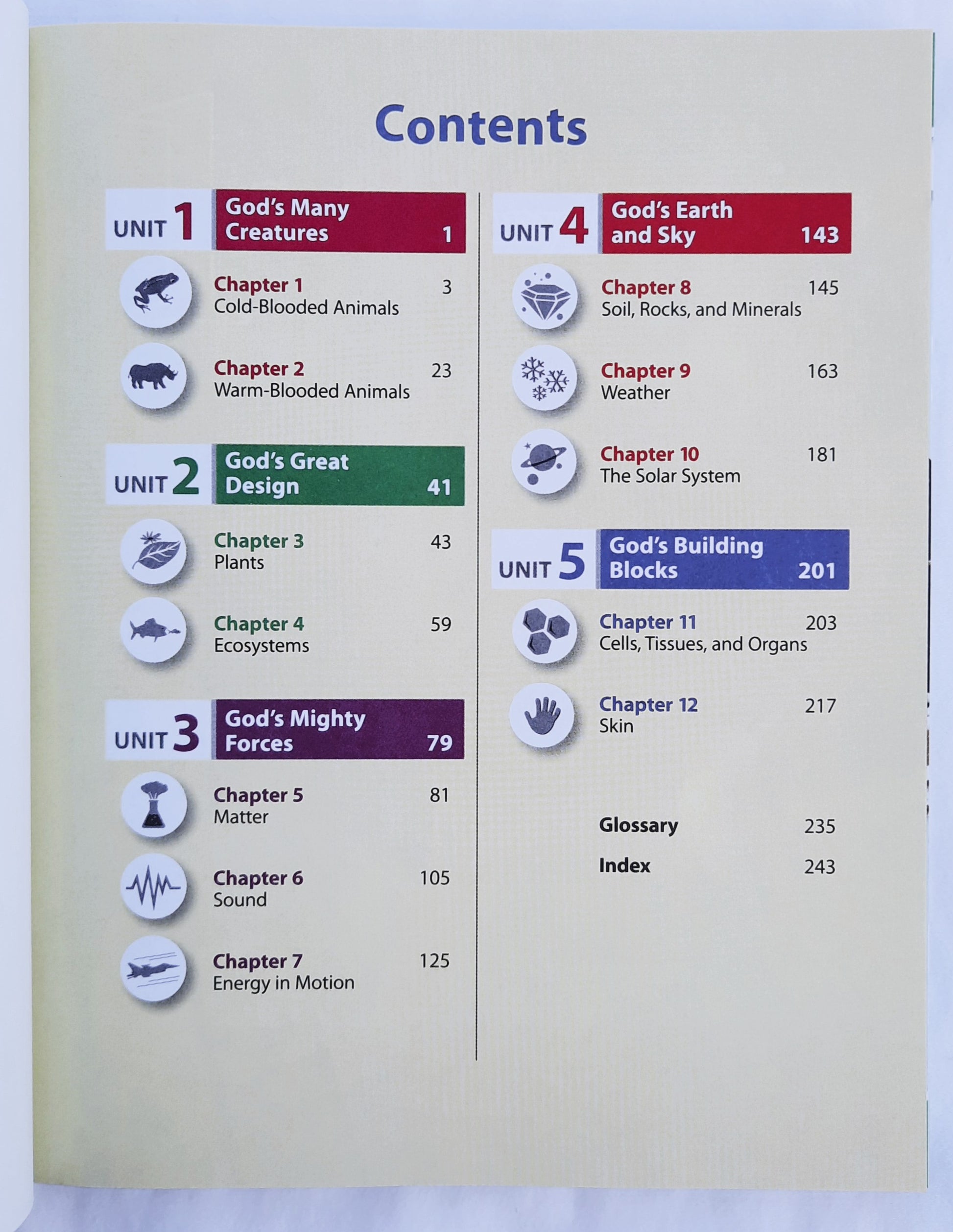 The SCIENCE 3 Student Text provides age-appropriate scientific information through text, diagrams, and charts, as well as annotated photographs and illustrations. Special interest boxes occur throughout the book and Quick Check sections are included in all text lessons. The Student Text also contains instructions for experiments, activities, and projects. The last page of each chapter provides key terms and concepts as well a brief writing exercise that applies higher-level thinking skills. A glossary and index are located at the end of the book.
