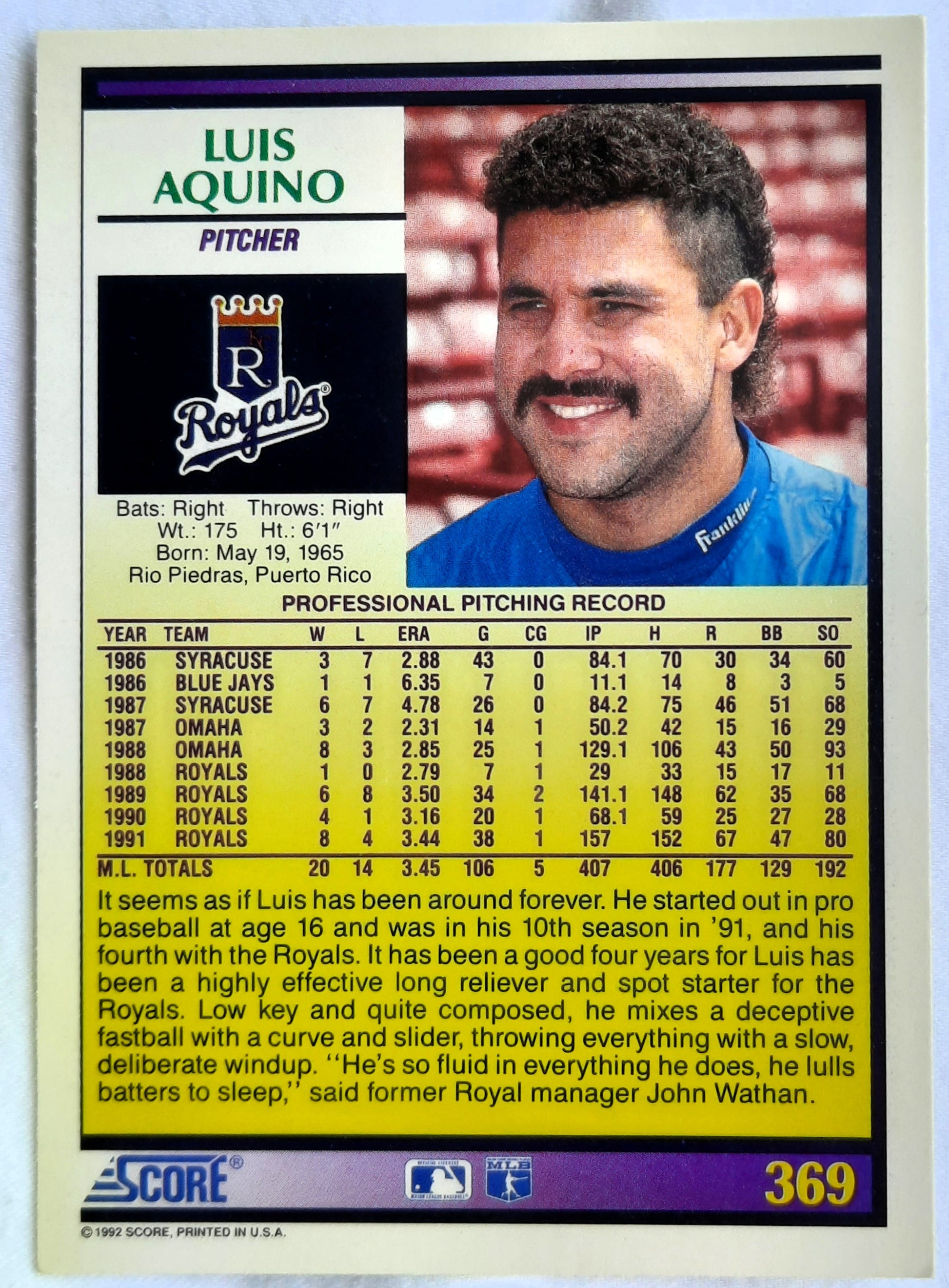 Score '92 Luis Aquino Pitcher #369 Kansas City Royals Baseball Card Near Mint