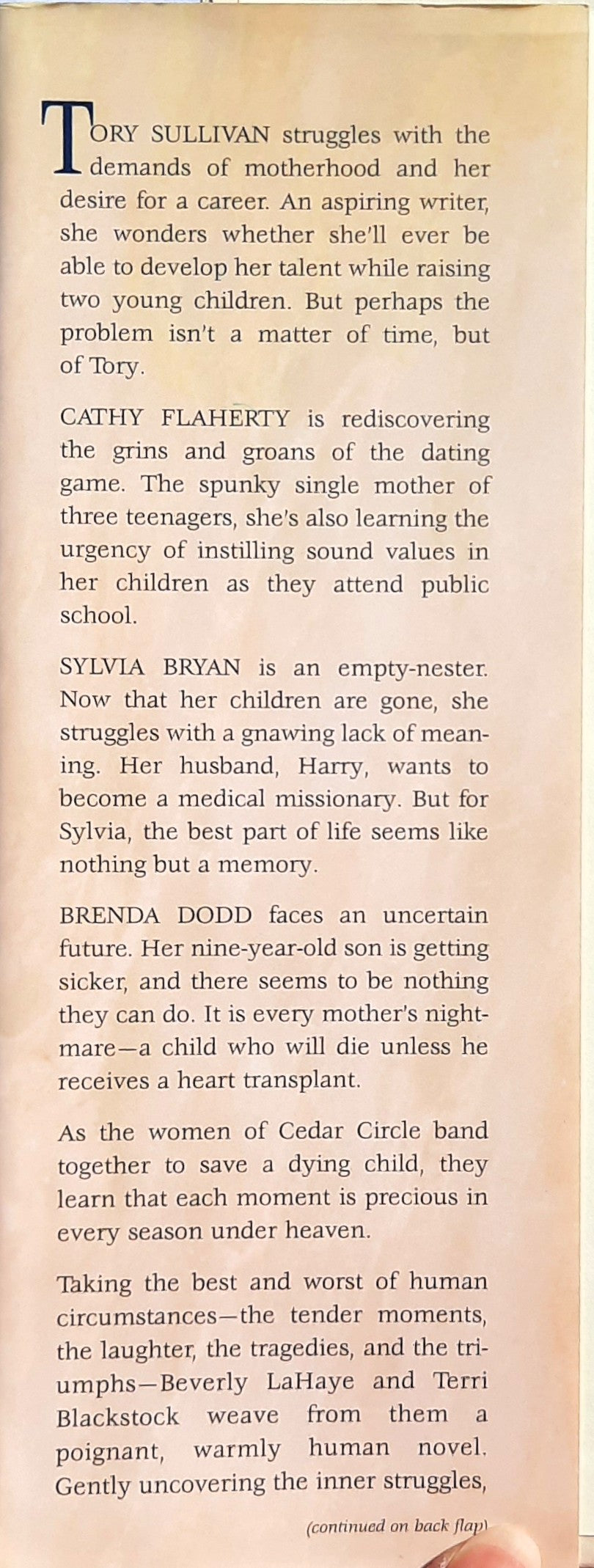 As the women of Cedar Circle band together to save a dying child, they learn that each moment is precious in every season under the heaven. Taking the best and worst of human circumstances—the tender moments, the laughter, the tragedies, and the triumphs—Beverly LaHaye and Terri Blackstock weave from them a poignant, warmly human novel. Gently uncovering the inner struggles, stresses, and joys that surface among neighbors living in a quiet cul-de-sac, the authors show us the power of ordinary lives being knit into a strong, many-textured fabric of family and friendships. Seasons Under Heaven depicts the deepest emotions of a woman's heart, and those circumstances, both thrilling and tragic, that test and strengthen Christian faith.