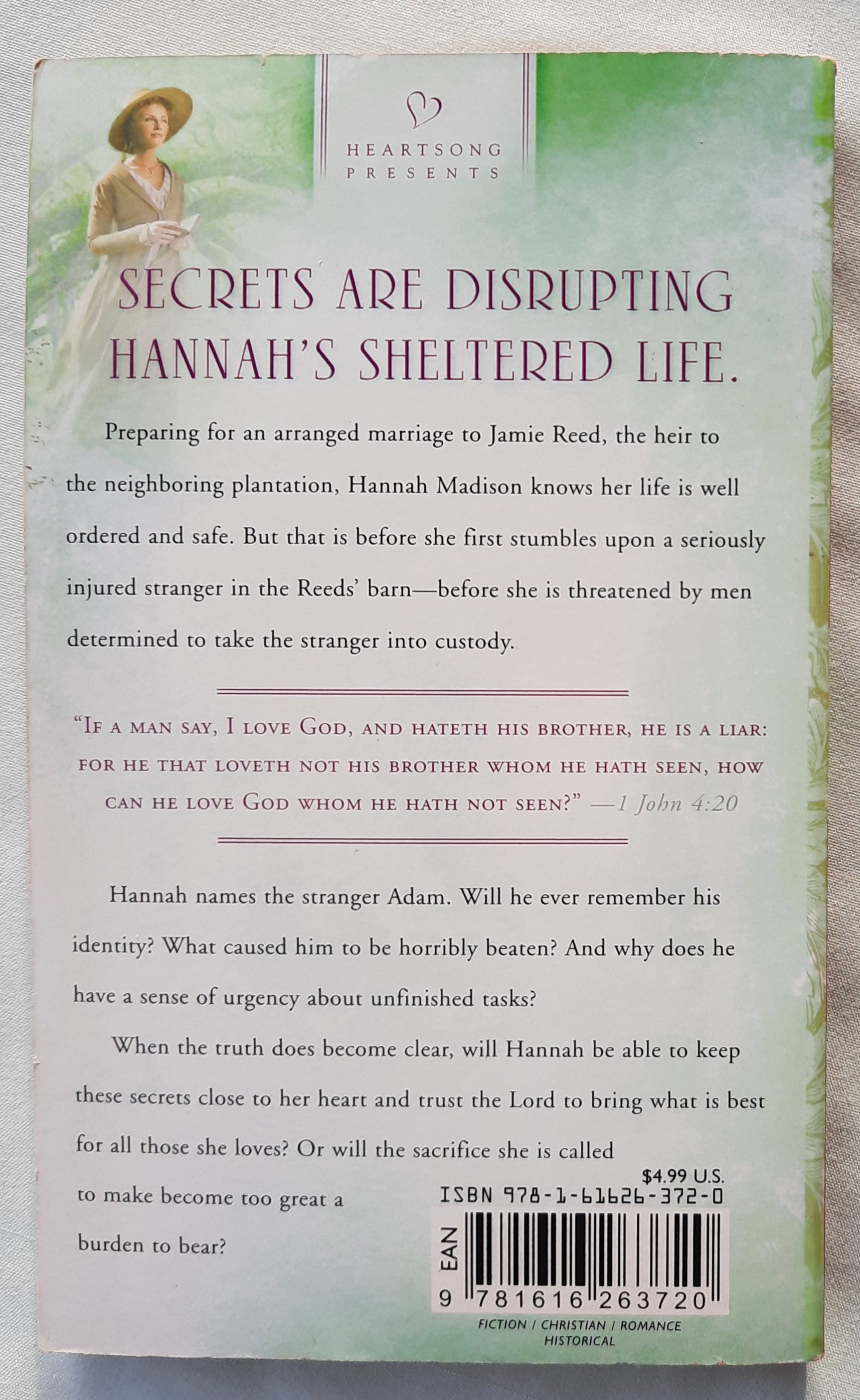 Preparing for an arranged marriage to Jamie Reed, the heir to the neighboring plantation, Hannah Madison know her life is well-ordered and safe. But that was before she first stumbled upon a seriously injured stranger in the Reeds' barn. Hannah names the stranger Adam. Will he ever remember his identity? What caused him to be horribly beaten? And why does he have a sense of urgency about unfinished tasks?
