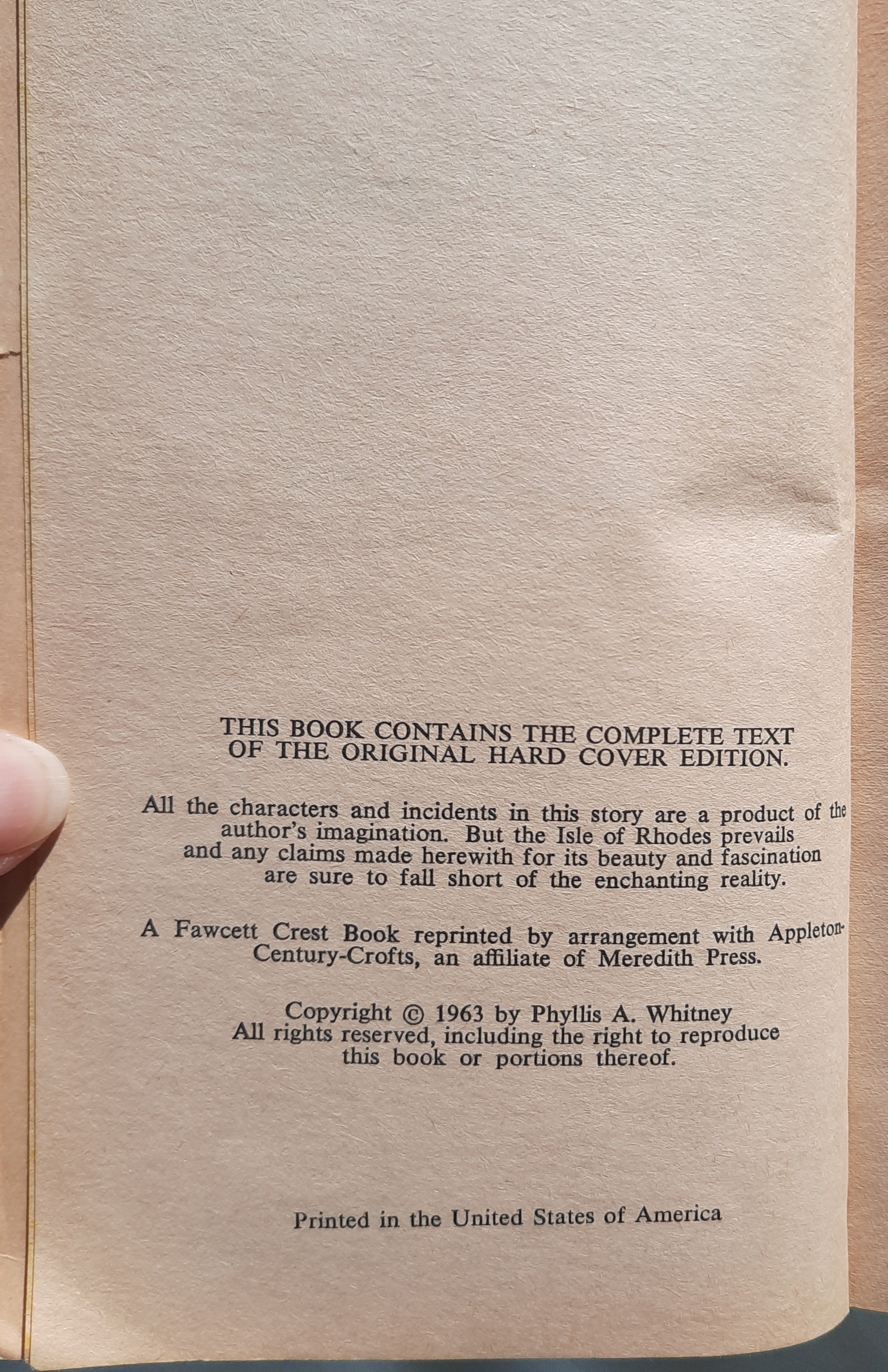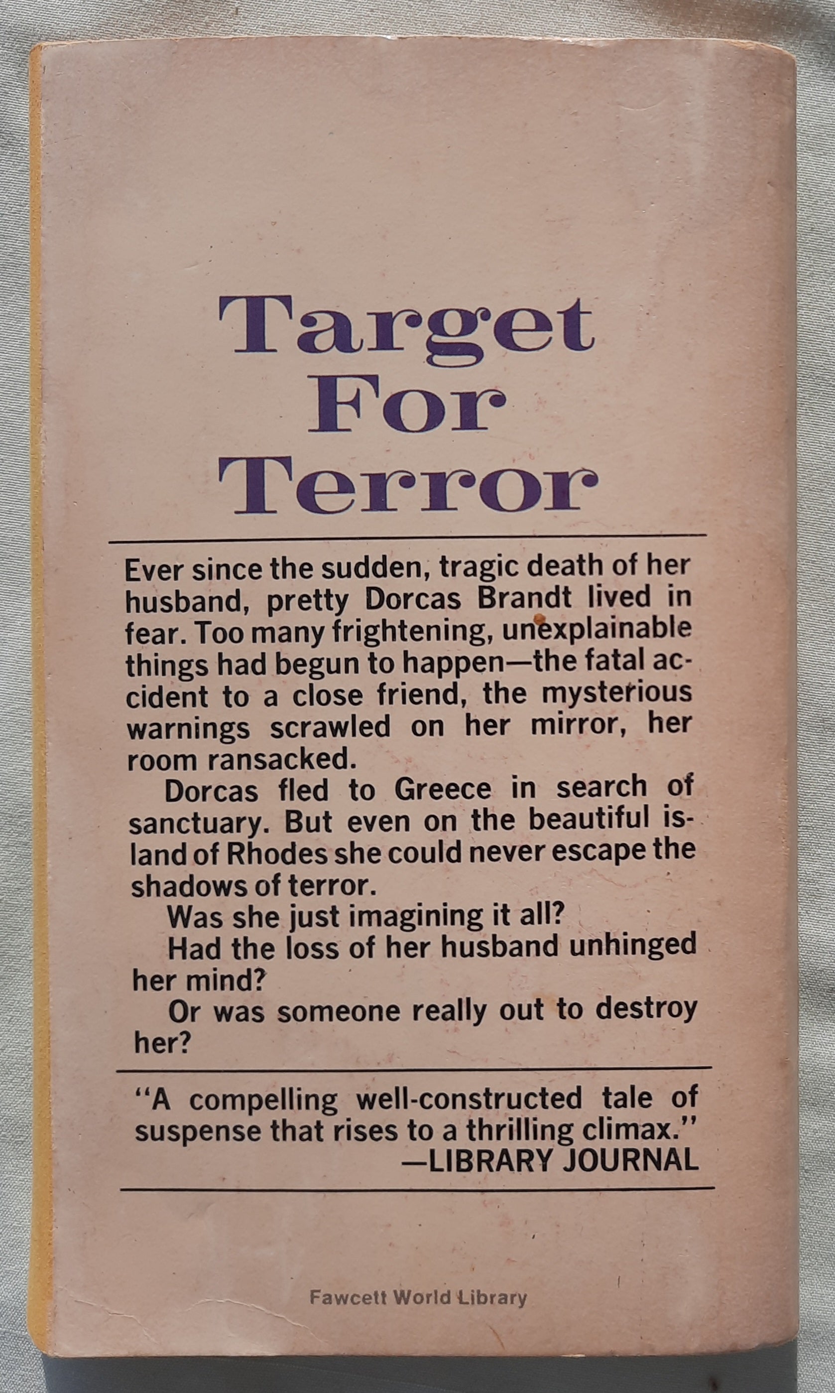 Ever since the sudden, tragic death of her husband, pretty Dorcas Brandt lived in fear. Too many frightening, unexplainable things had begun to happen - the fatal accident to a close friend, the mysterious warnings scrawled on her mirror, her room ransacked. Dorcas fled to Greece in search of sanctuary. But even on the beautiful island of Rhodes she could never escape the shadows of terror. Was she just imagining it all? Had the loss of her husband unhinged her mind? Or was someone really out to destroy her?