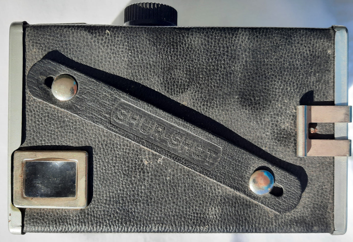 The Shur Shot camera is a simple cardboard box covered with leatherette. A structural panel of wood behind the faceplate holds the shutter mechanism (approximately 1/30 of a second), and a fixed aperture of approximately f/13. The image is formed by a single backward-facing meniscus lens behind this.