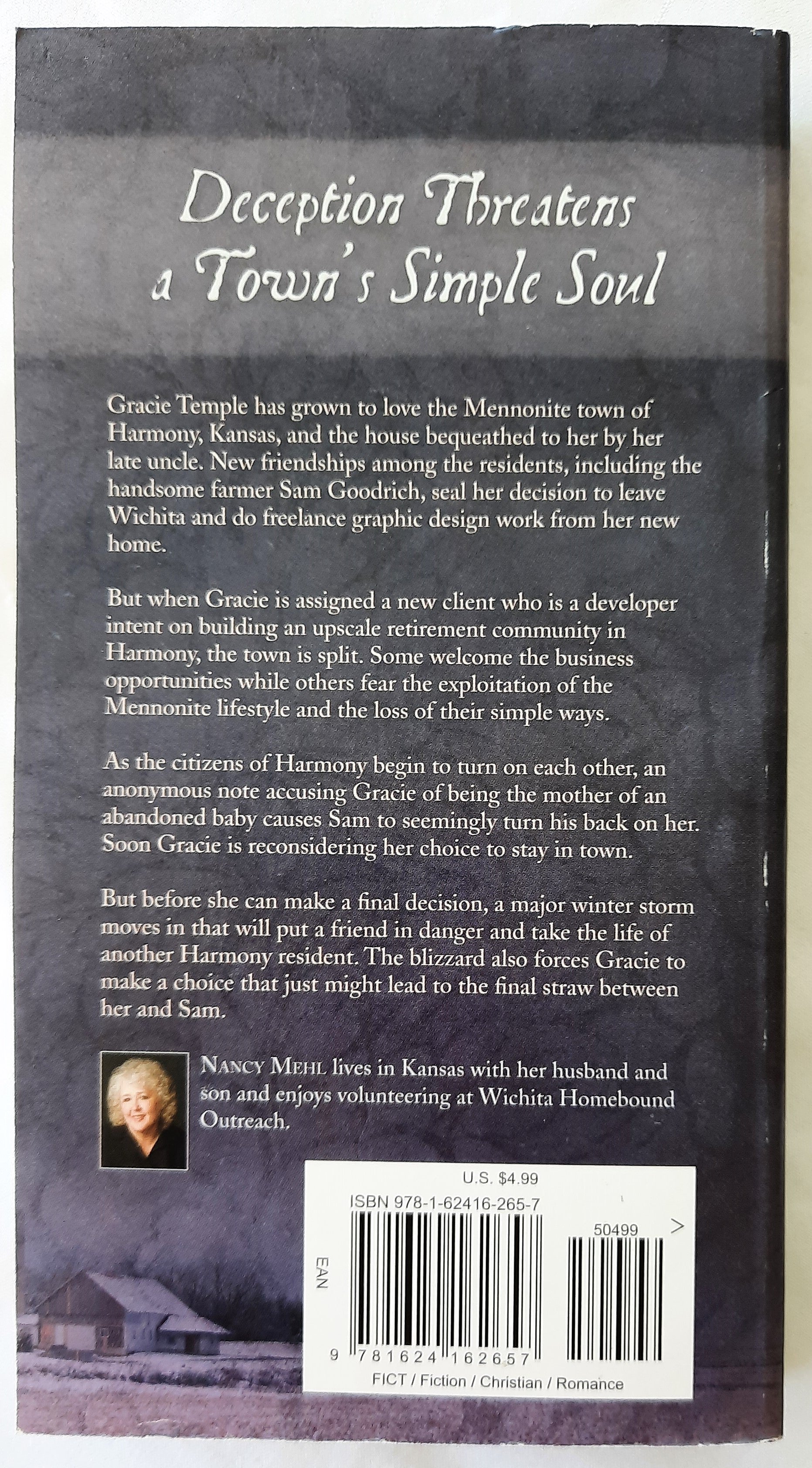 In the sequel to Simple Secrets, watch how a raging current of deceit runs through the once peaceful Mennonite community of Harmony, Kansas. As soon as Gracie decides to stay in town and take freelance work involving a local land developer, the townspeople blame her for bringing on this change that could ruin life as they know it. Gracie’s motives in romance with Sam, in helping an oppressed teenager, and in trying to make a living are all suddenly drawing suspicion. Should she leave or stay and fight for what she has come to love?