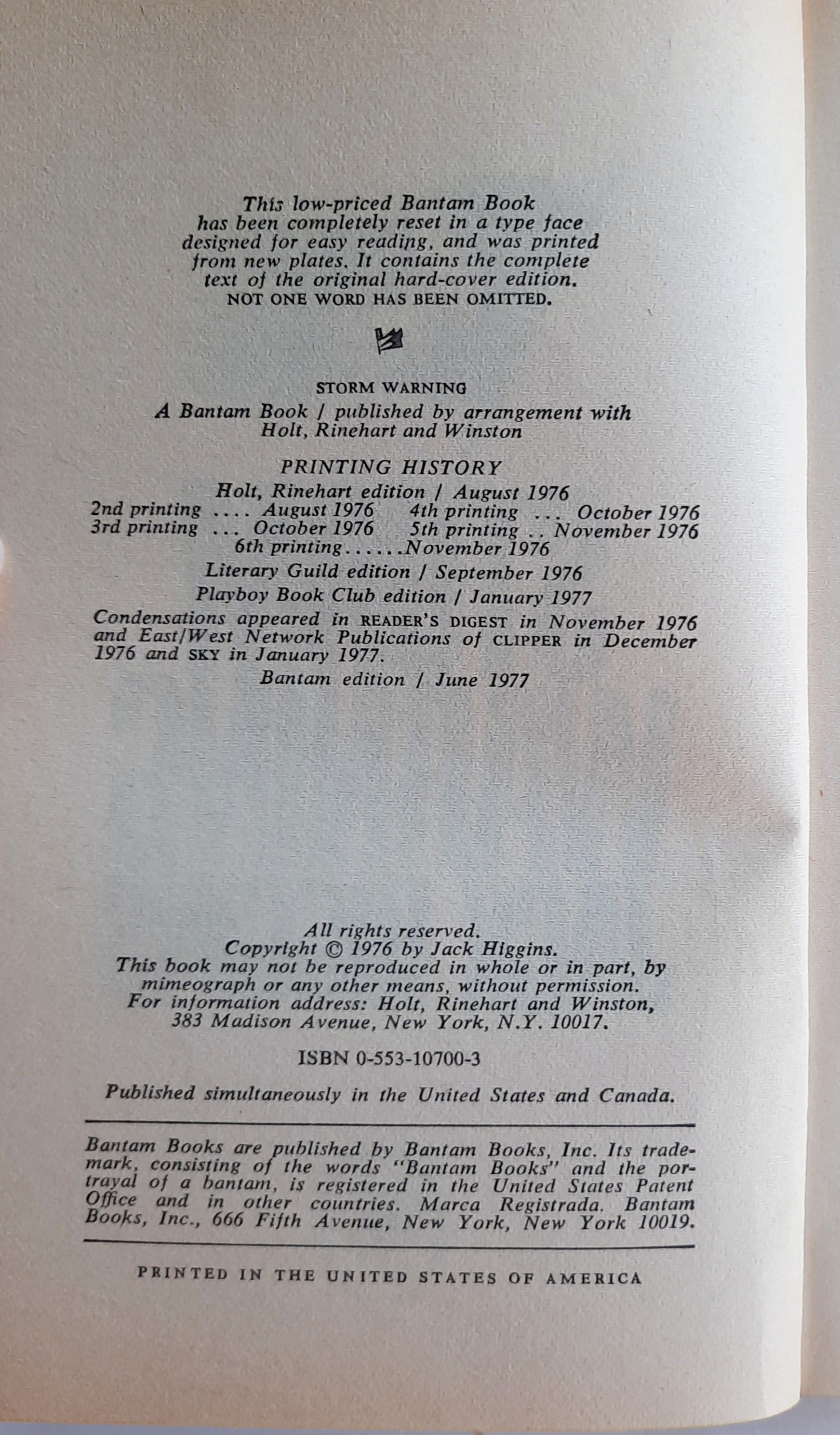 Storm Warning by Jack Higgins (Good, 1977, Pbk, 276 pages, Bantam Books)