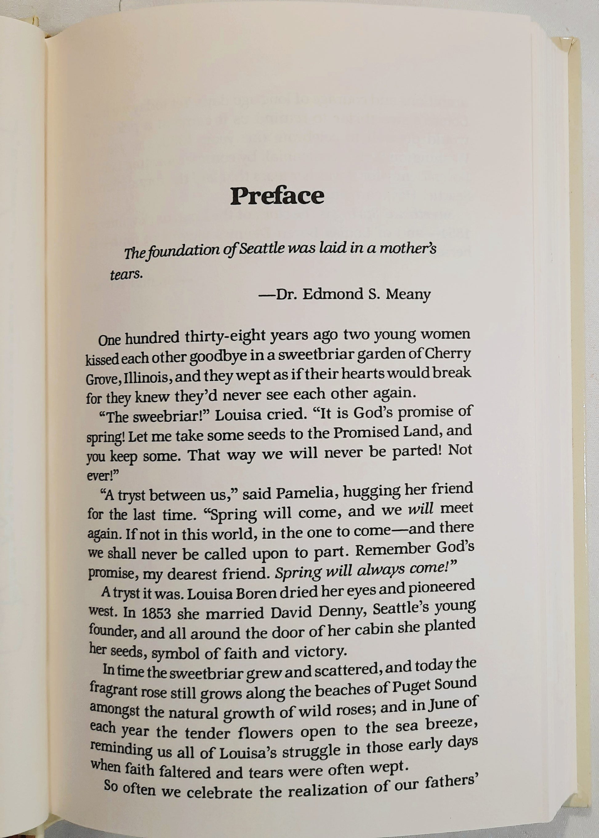 In 1851 two women kissed each other goodbye in a sweetbriar garden in Illinois. They wept for they knew they'd never see each other again. Louisa was moving to Oregon. "The sweetbriar!" Louisa cried. "They are God's promise of spring! Let me take some seeds to the Promised Land, and you deep some. That way we will never be parted! Not ever!"