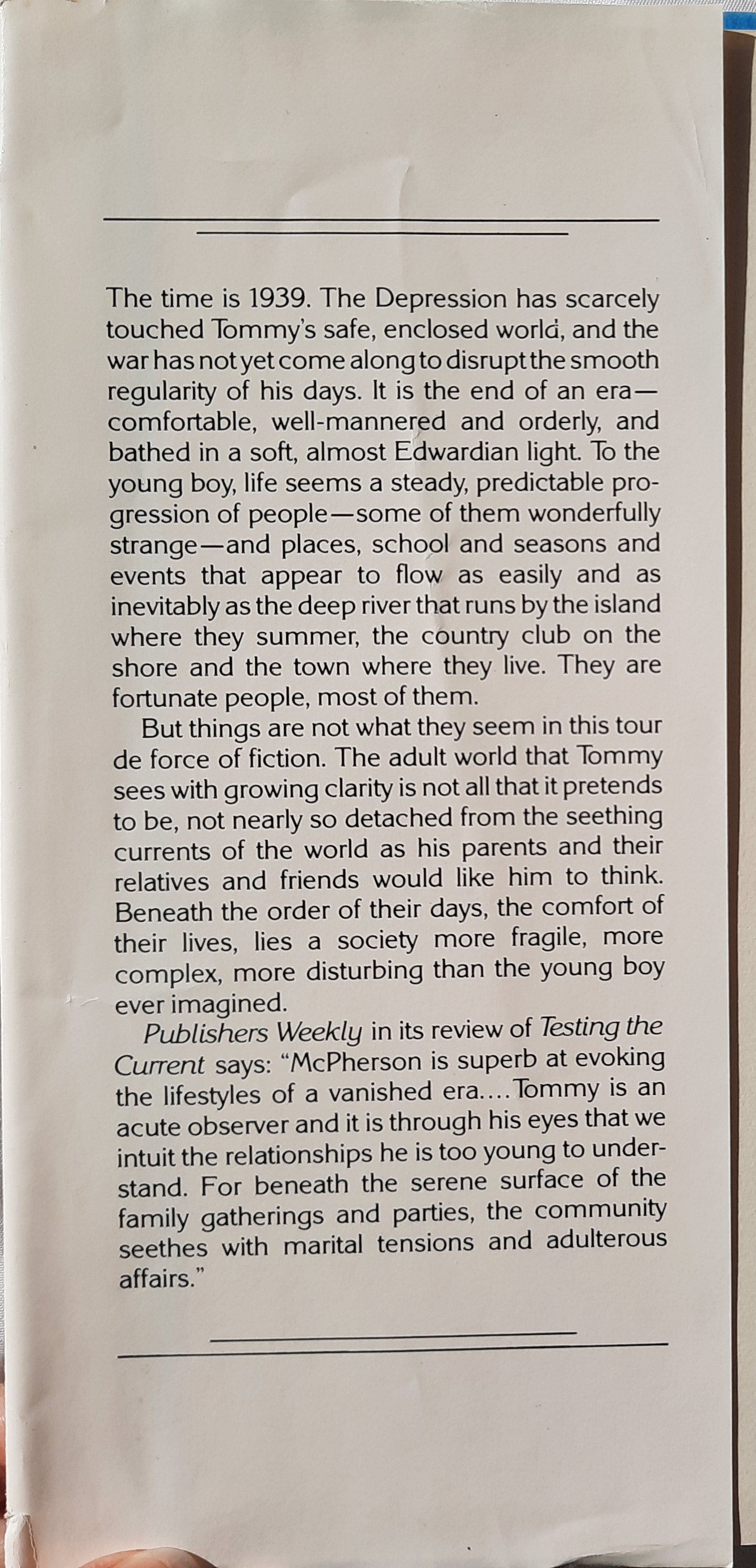 In Testing the Current William McPherson subtly sets off his wide-eyed protagonist’s perspective with mature reflection and wry humor and surrounds him with a cast of vibrant characters, creating a scrupulously observed portrait of a place and time that will shimmer in readers’ minds long after the final page is turned.