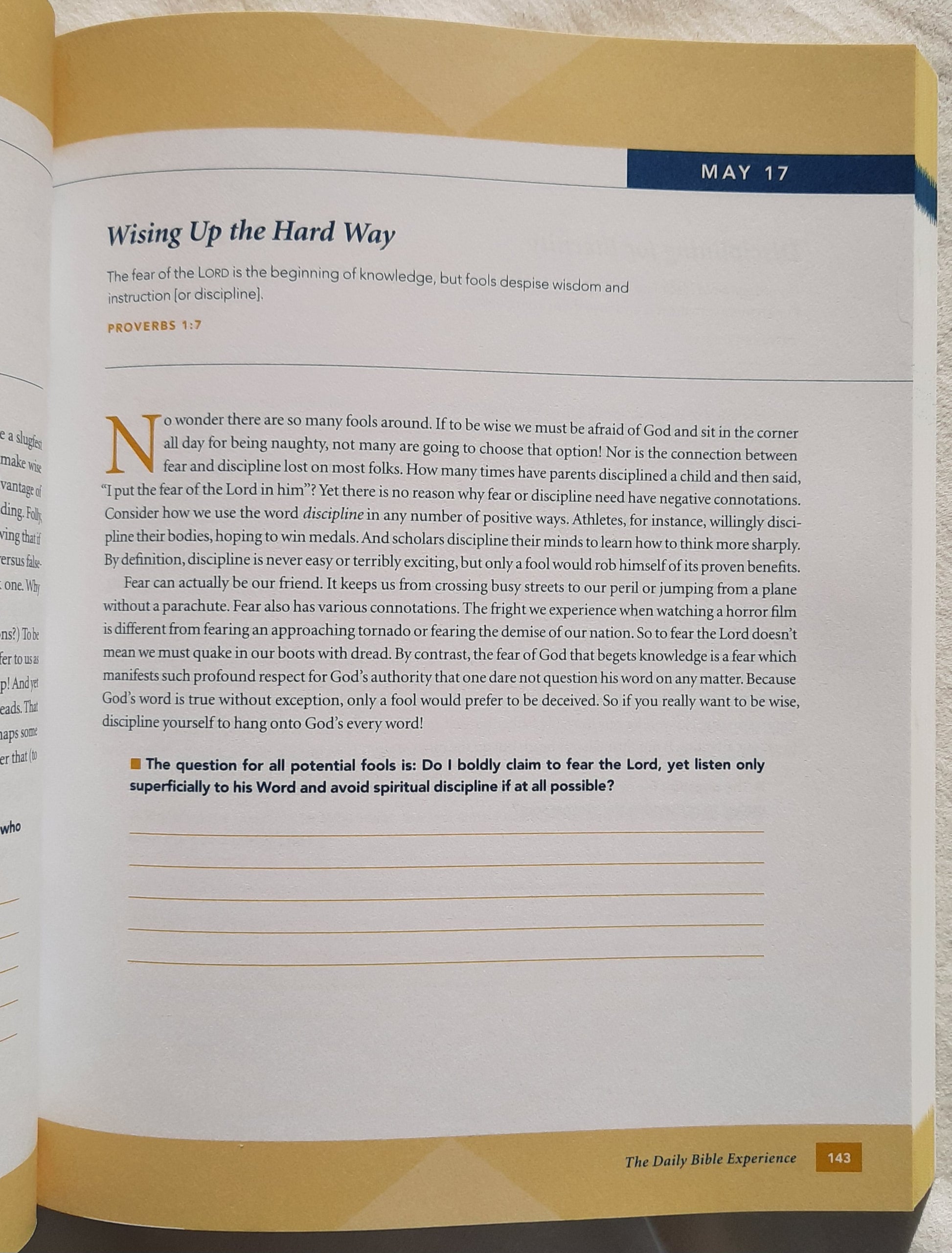 This collection of thoughtful devotions can be used alongside TheDaily Bible® or by itself, and includes space for you to journal your own reflections. The Daily Bible® Experience will help you meditate on the mystery and power of faith, and provide a year of encouragement, strength, and inspiration that will have you seeking God with ever more reverence and wonder.
