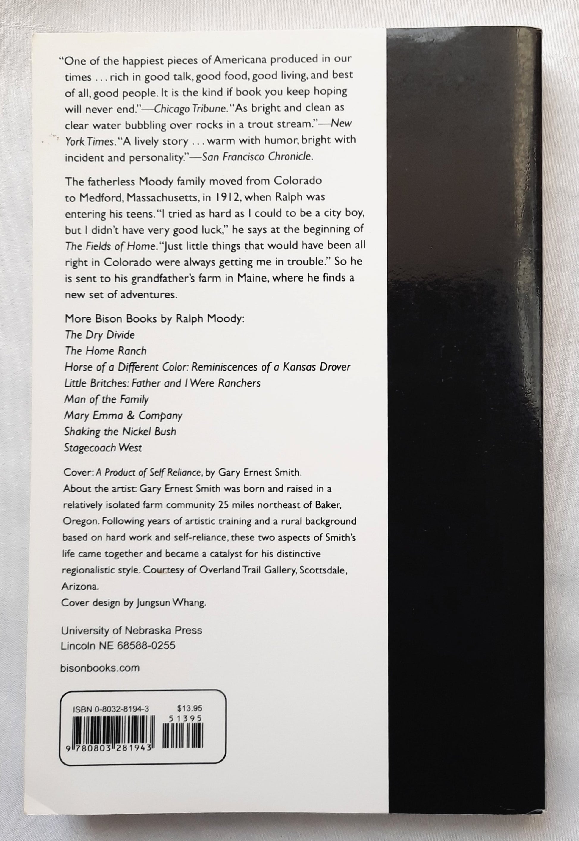 The fatherless Moody family moved from Colorado to Medford, Massachusetts, in 1912, when Ralph was entering his teens. "I tried as hard as I could to be a city boy, but I didn't have very good luck," he says at the beginning of The Fields of Home. "Just little things that would have been all right in Colorado were always getting me in trouble." So he is sent to his grandfather's farm in Maine, where he finds a new set of adventures.