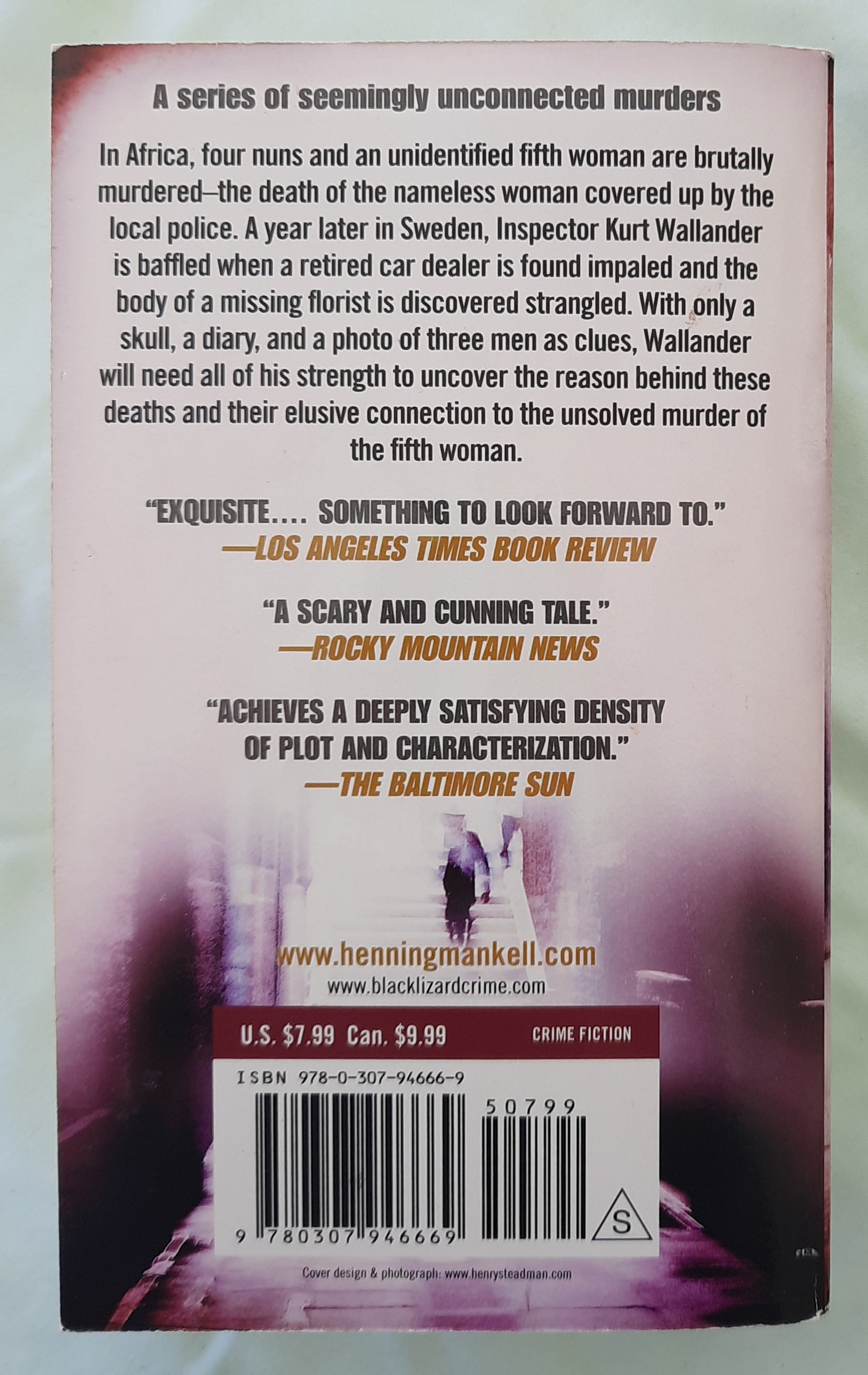 In an African convent, four nuns and a unidentified fifth woman are brutally murdered--the death of the unknown woman covered up by the local police. A year later in Sweden, Inspector Kurt Wallander is baffled and appalled by two murders. Holger Eriksson, a retired car dealer and bird watcher, is impaled on sharpened bamboo poles in a ditch behind his secluded home, and the body of a missing florist is discovered--strangled and tied to a tree. The only clues Wallander has to go on are a skull, a diary, and a photo of three men. What ensues is a case that will test Wallander’s strength and patience, because in order to discover the reason behind these murders, he will also need to uncover the elusive connection between these deaths and the earlier unsolved murder in Africa of the fifth woman.