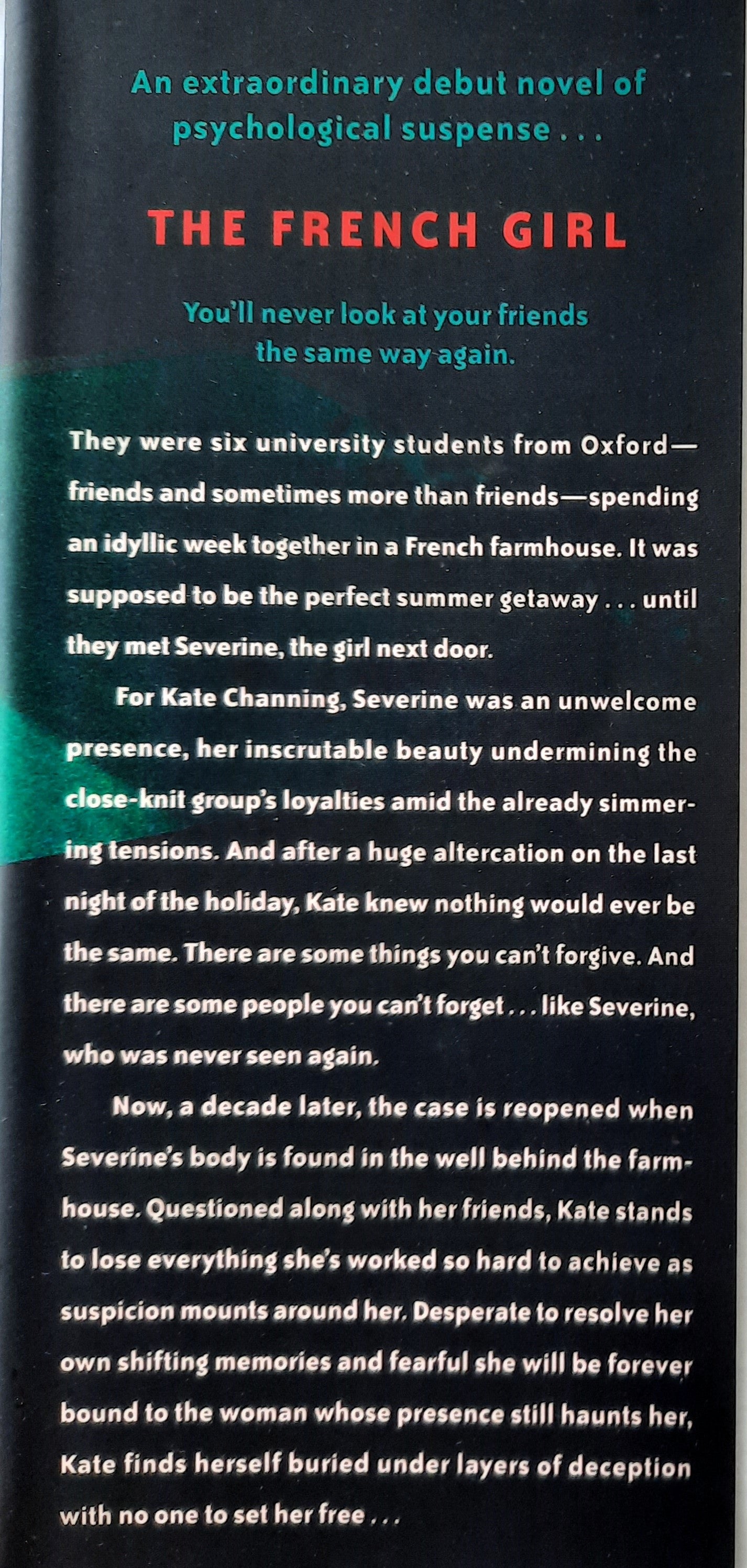 A decade later, the case is reopened when Severine's body is found behind the farmhouse. Questioned along with her friends, Kate stands to lose everything she's worked so hard to achieve as suspicion mounts all around her. Desperate to resolve her unreliable memories and fearful she will be forever bound to the memory of the woman who still haunts her, Kate finds herself entangled within layers of deception with no one to set her free....